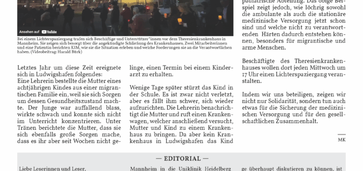 Neue KIM Ausgabe erschienen – mit Digital-Abo im E-Mail Postfach – mit Print-Abo im Briefkasten. Alle Infos zum Abo gibt es hier: KIM abonnieren. – Editorial – Liebe Leserinnen und Leser, die überraschend frühe Schließung des BBT-Krankenhauses Theresien bewegt die Gemüter in Mannheim: Sie ist einerseits ein Schlag v.a. gegen...