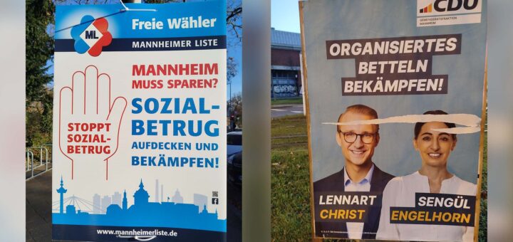 „Sozialbetrug stoppen“ steht auf blauen Plakaten, die in großer Zahl an Mannheimer Straßenlaternen gehängt wurden. Trotz blauer Farbe ist dafür nicht die AfD, sondern die Fraktion der Freien Wähler/Mannheimer Liste verantwortlich. Etwas weniger prominent hängen Plakate der CDU auf denen gegen „Organisiertes Betteln“ Stimmung gemacht. Warum gerade jetzt zur Adventszeit?...
