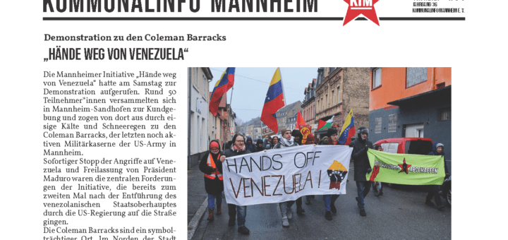 Die Mannheimer Initiative „Hände weg von Venezuela“ hatte am Samstag zur Demonstration aufgerufen. Rund 50 Teilnehmer*innen versammelten sich in Mannheim-Sandhofen zur Kundgebung und zogen von dort aus durch eisige Kälte und Schneeregen zu den Coleman Barracks, der letzten noch aktiven Militärkaserne der US-Army in Mannheim. Sofortiger Stopp der Angriffe auf...