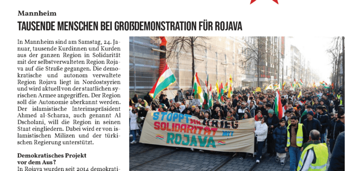 In Mannheim sind am Samstag tausende Kurdinnen und Kurden aus der ganzen Region in Solidarität mit der selbstverwalteten Region Rojava auf die Straße gegangen. Die demokratische und autonom verwaltete Region Rojava liegt in Nordostsyrien und wird aktuell von der staatlichen syrischen Armee angegriffen. Der Region soll die Autonomie aberkannt werden....