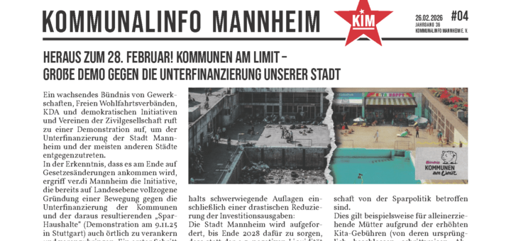 Neue KIM Ausgabe erschienen – mit Digital-Abo im E-Mail Postfach – mit Print-Abo im Briefkasten. Alle Infos zum Abo gibt es hier: KIM abonnieren. – Editorial – Aus aktuellem Anlass verweisen wir auf die Demonstration am kommenden Samstag in Mannheim „Kommunen am Limit“. Thomas Trüper unterstreicht in seinem Artikel die...