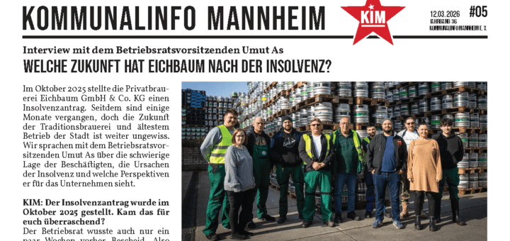 Bei einer Betriebsversammlung haben Beschäftigte der Brauerei Eichbaum auf ihre Situation aufmerksam gemacht. Nach der Insolvenz ist die Zukunft völlig ungewiss. 285 Arbeitsplätze sind in Gefahr. Videobeitrag bei Youtube: https://youtu.be/eTIb0D2Pjic (cki) Mehr zum Thema Interview mit Betriebsrat Umut As: https://kommunalinfo-mannheim.de/2026/03/11/welche-zukunft-hat-eichbaum-nach-der-insolvenz-interview-mit-dem-betriebsratsvorsitzenden-umut-as/