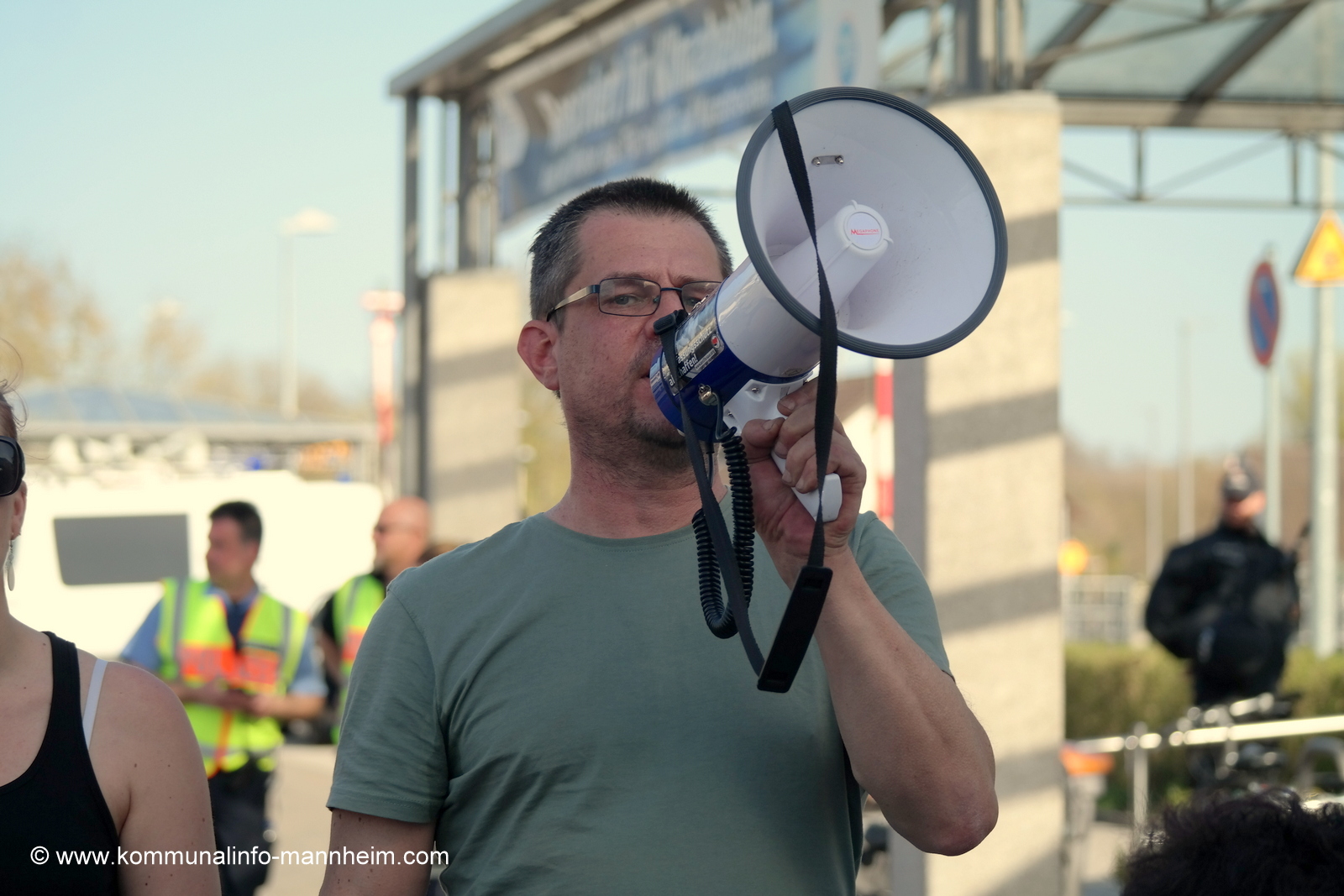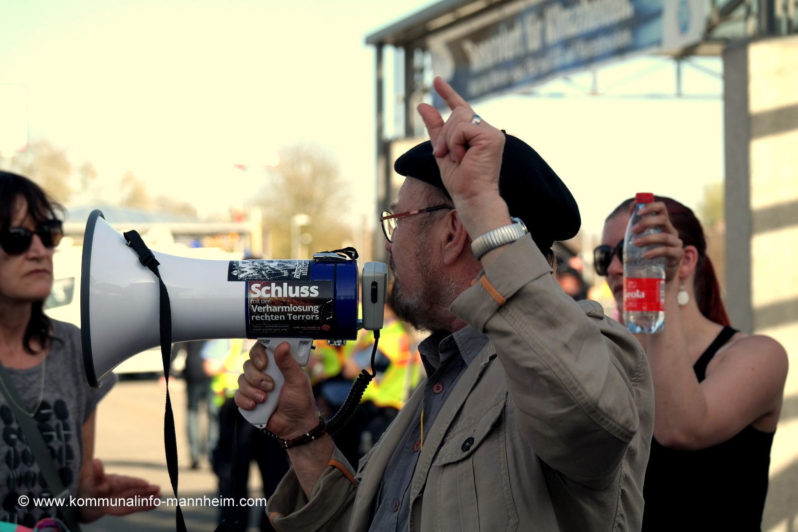 Unerträglich empfanden es viele Teilnehmer, dass die Polizei NPD- und AfD-Vertreter, sowie pöbelnde Hooligans direkt am Versammlungsort am Saubrunnen durchschleuste, um den Rechten den möglichst kürzesten Weg zum Marktplatz zu ermöglichen. In den Reden wurde das Verhalten der Ordnungsbehörde Germersheim angeprangert, welche am Freitag angemeldete Mahnwachen nicht wie von den Veranstaltern gewünscht, sondern nur konzentriert auf dem Bahnhofsvorplatz, genehmigte. Aus Protest sagten die Anmelder daraufhin ihre Mahnwachen ab. Weder Polizei, noch Ordnungsbehörde waren am 7.4. willens oder in der Lage den nachfragenden Pressevertretern vor Ort Auskunft erteilen zu wollen. Die polizeiliche Einsatzleitung sagte hierzu: „Sache der Ordnungsbehörde“. Die Vertreterin der Ordnungsbehörde formulierte: „Man könne hierzu keine Stellungnahme abgeben, da dies alleinig im Ermessungsspielraum der Polizei liege.“ Was nun und wer hat welche Befugnisse? Eindeutig wurde dem Presseauskunftsrecht an dieser Stelle nicht genügend gedient.