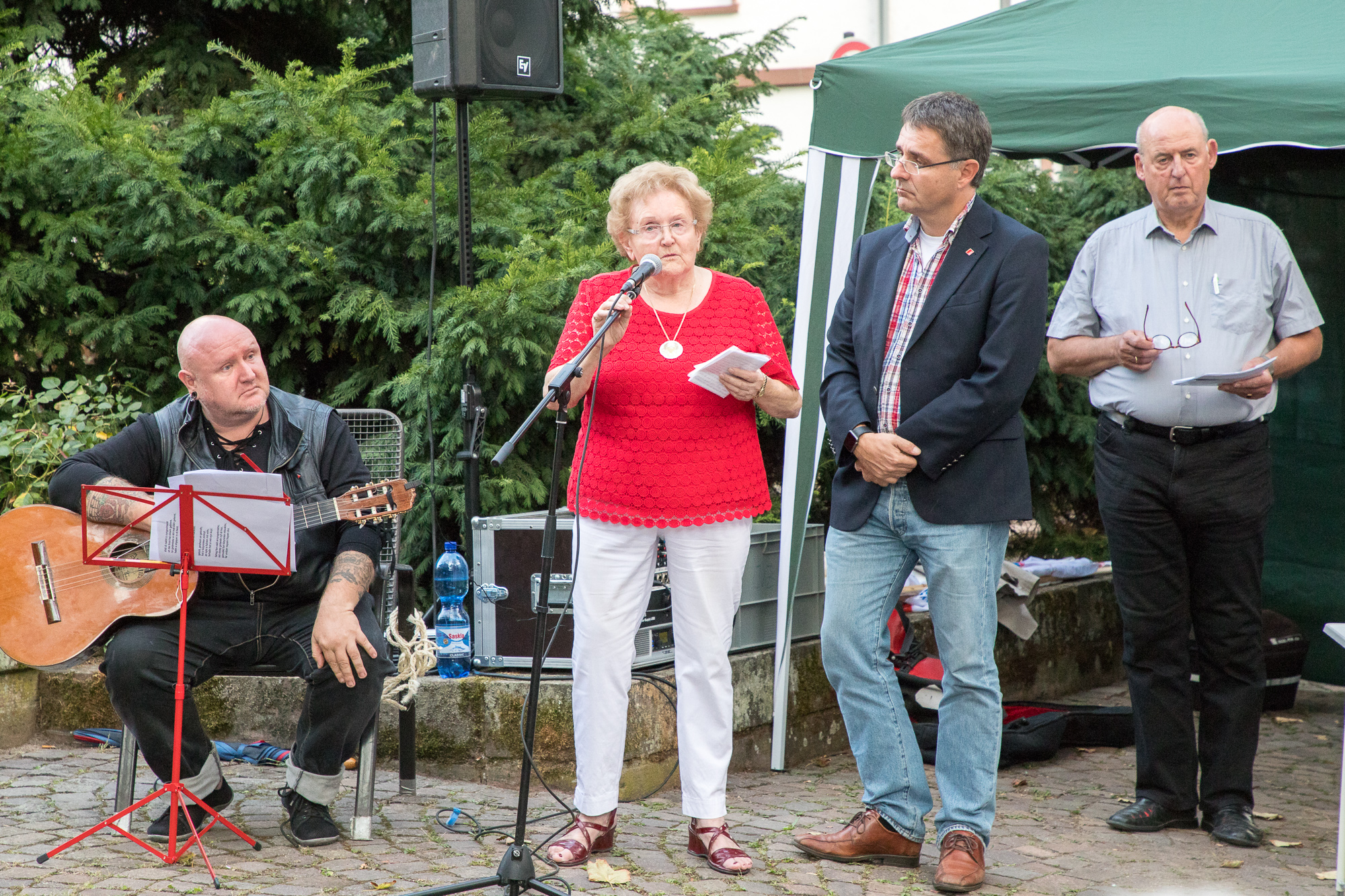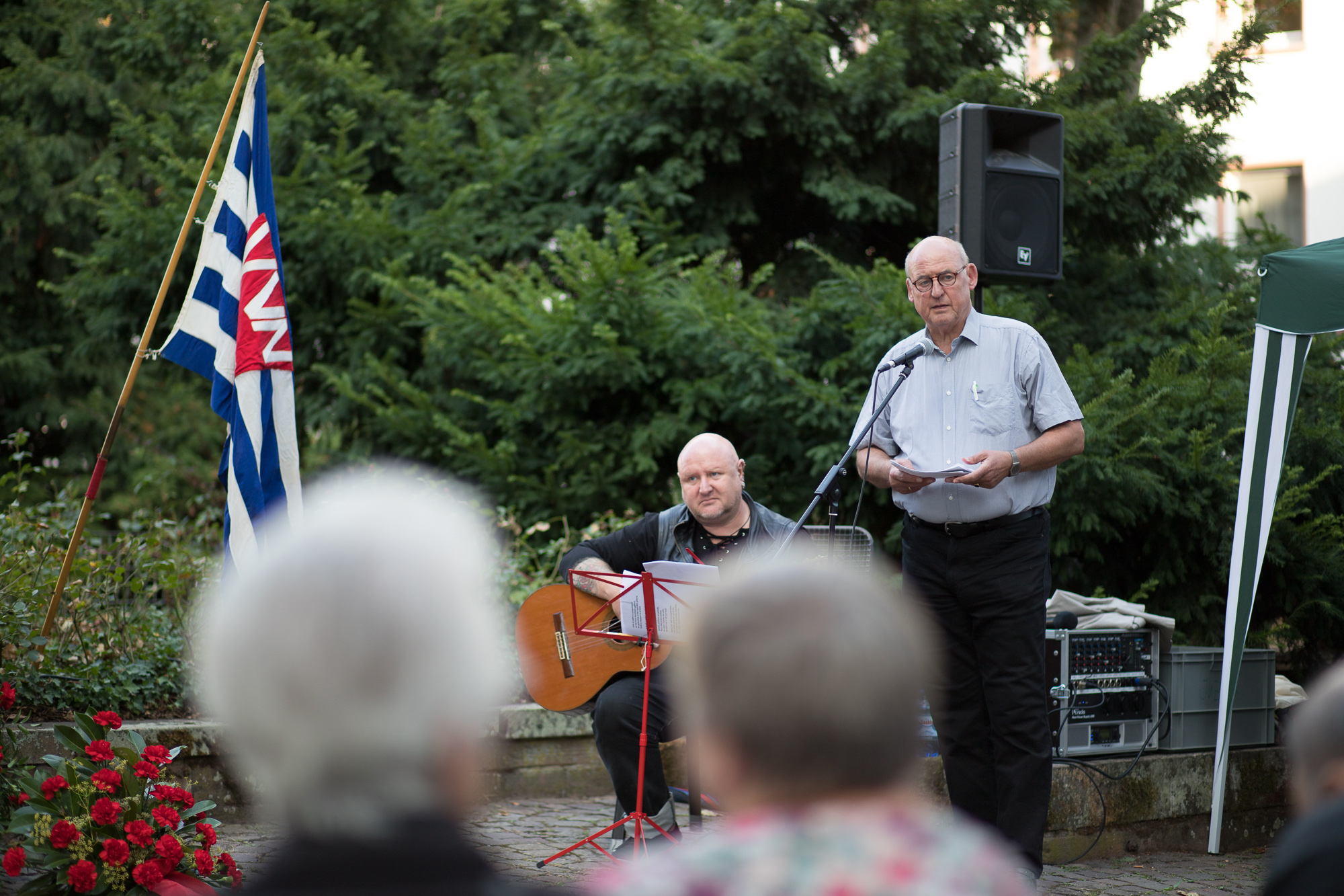 Michael Csaszkóczy sang zur Gitarre antifaschistische und Freiheitslieder. Eine kurze, aber sehr beeindruckenden Rede hielt die 89-jährige Karla Spagerer, deren Eltern und Großeltern mit der Familie Lechleiter, befreundet waren. Für die damals 13-Jährige waren es unvergessene und schreckliche Momente, als sie auf einer Litfaßsäule auf dem Waldhof von der Hinrichtung von Georg Lechleiter und seinen GenossInnen durch das Fallbeil erfuhr.