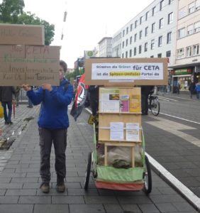 Das Mannheimer Bündnis für gerechten Welthandel beteiligte sich an der Kundgebung am 1. Mai2020 auf dem Marktplatz mit einem Infowagen und Plakaten mit einer klaren Ansage an die Baden-Württemberger Grünen, um sie an ihre eigenen Beschlüsse und Wahlzusagen zu erinnern: Die Landesregierung kann im Bundesrat gegen CETA zu stimmen oder sich enthalten, was eine Ablehnung bedeutet.