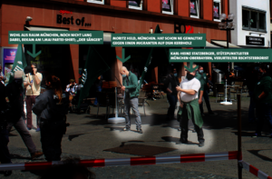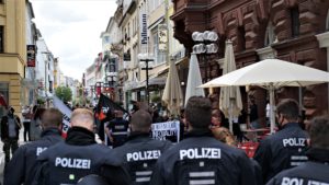 Schon vor Beginn der Nazikundgebung sammelte sich am Stiftsplatz der antifaschistische Gegenprotest auf einer Kundgebung gegen Naziterror und rassistische Gewalt, die von Mitgliedern des Bündnisses „Kaiserslautern gegen Rechts“ organisiert war. Als der III. Weg seine Kundgebung eröffnete, verließen die Antifaschistinnen und Antifaschisten den Stiftsplatz, um die rechte Hetze von mehreren Seiten lautstark zu stören.