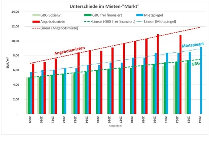Diese Argumentation halten wir völlig abwegig. Von 2018 bis 2025 sind die durchschnittlichen Mieten um 19.2 % auf 9.19 Euro pro Quadratmeter gestiegen, die Angebotsmieten für Neuvermietungen nochmals um einiges mehr.