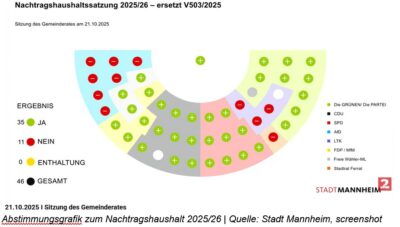 Auch Nalan Erol (LTK) erklärte, die Fraktion werde dem Nachtragshaushalt nicht zustimmen. Mannheim habe in der Vergangenheit keineswegs „über seine Verhältnisse gelebt“. Vielmehr seien die Kommunen strukturell unterfinanziert, weil in Berlin die herrschenden Parteien es nicht wagten, durch eine Steuerreform die Milliardäre zur Kasse zu bitten. Erol begrüßte die Anhebung der Beherbergungssteuer und die Wohnraum-Zweckentfremdungsabgabe. Sie kritisierte dagegen die totale Unterfinanzierung des Eigenbetriebs Stadt-Raum-Service. „Vielleicht müssen wir bald damit rechnen, dass keine Müllfahrzeuge fahren.“ Bezüglich der geplanten Schließung der Albrecht-Dürer-Schule beklagte sie, dass die Darstellung der Verwaltung gegenüber dem Fachausschuss nichts mit der Realität vor Ort zu tun habe. Ferner dürften die für die Mannheimer Bevölkerung so wichtigen Stadtparks nicht in die Insolvenz getrieben werden, indem die notwendige Erhöhung der Betriebskostenzuschüsse vorenthalten werde. Die Prioritäten seien falsch gesetzt und die Lastenverteilung falsch geregelt.