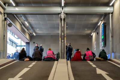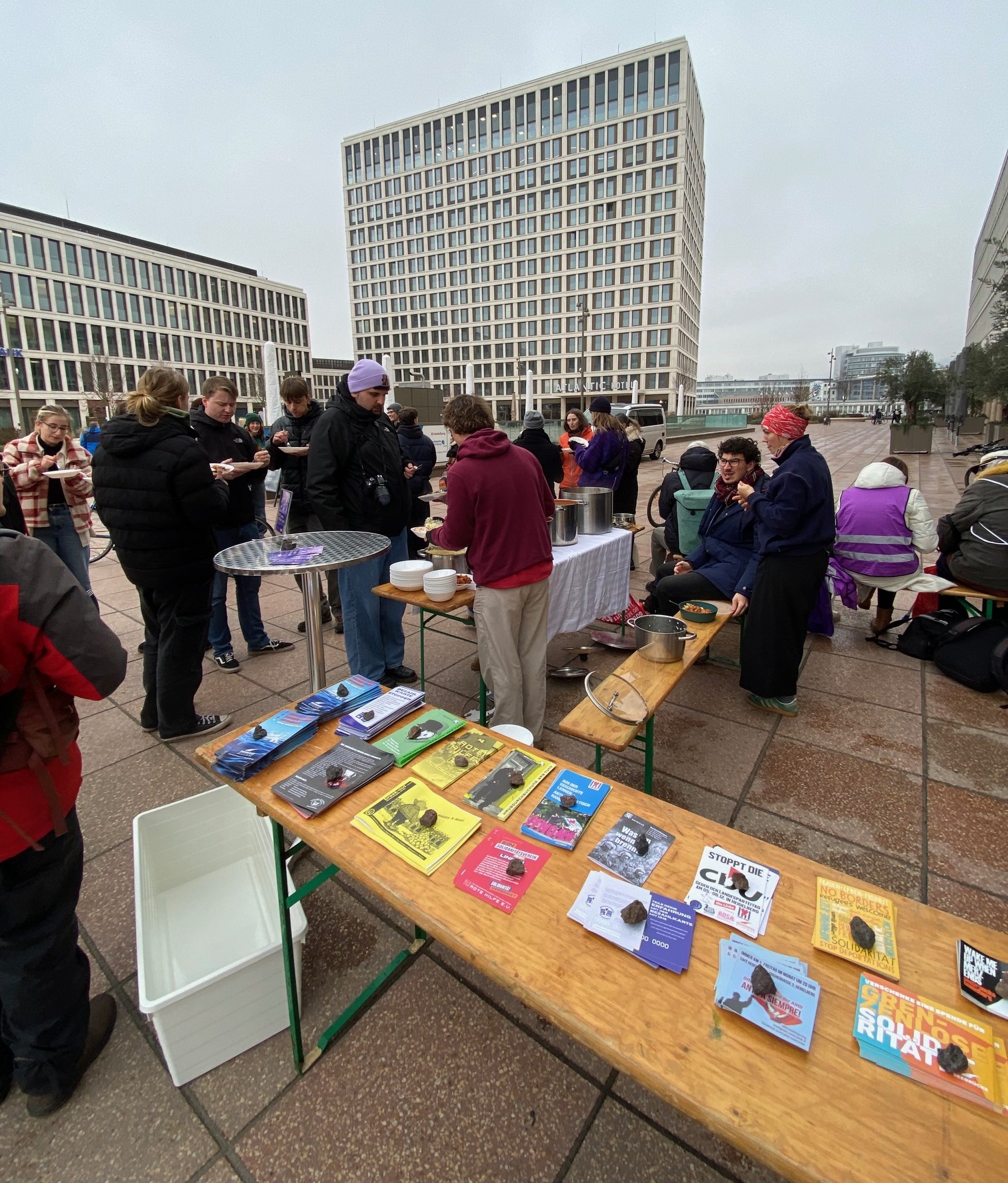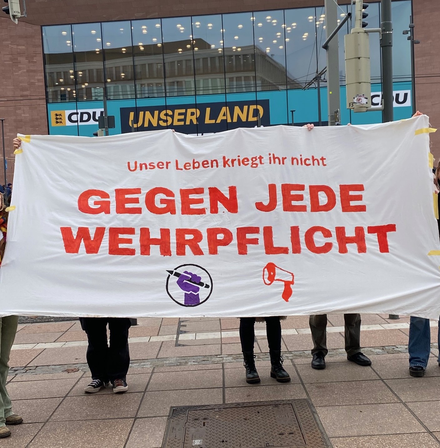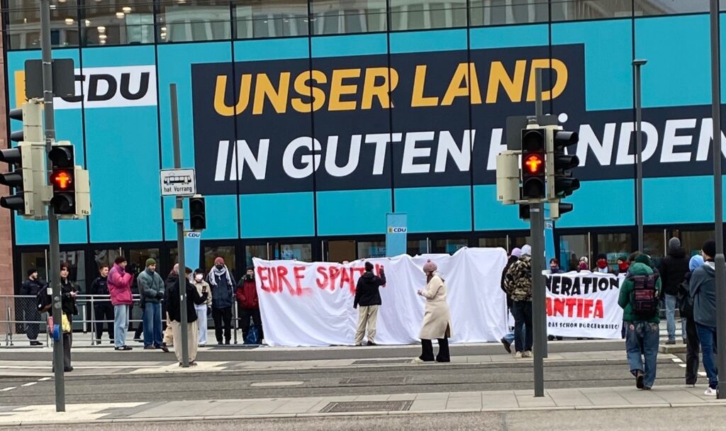 Am Freitag, den 05.12.2025 kam es im Rahmen des CDU-Landesparteitags in Heidelberg zu zahlreichen Protesten und Blockaden. Unter dem Leitspruch „Brände löschen – Solidarität statt rechter Hetze“ machten Kleingruppen an drei verschiedenen Stellen ihren Protest sichtbar. Vor dem Congress Center bemalten Aktivisti im Rahmen einer Kunst-Performance ein Banner mit der Aufschrift „Eure Spaltung ist kalkuliert, unser Widerstand ist solidarisch“, andere blockierten zeitweise die Zugänge zum Congress-Center. Die Tiefgarage des Gebäudes war für mehrere Stunden durch angeklebte Protestierende gesperrt. Zeitgleich konnten Menschen auf dem gegenüberliegenden Europaplatz ihre Solidarität bei zwei angemeldeten Mahnwachen zum Ausdruck bringen. Mit Essen auf Spendenbasis und durch die Unterstützung des „Schulstreik gegen Wehrpflicht“ blieben rund 100 Menschen den Nachmittag über vor Ort.