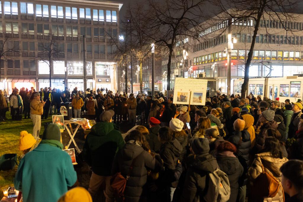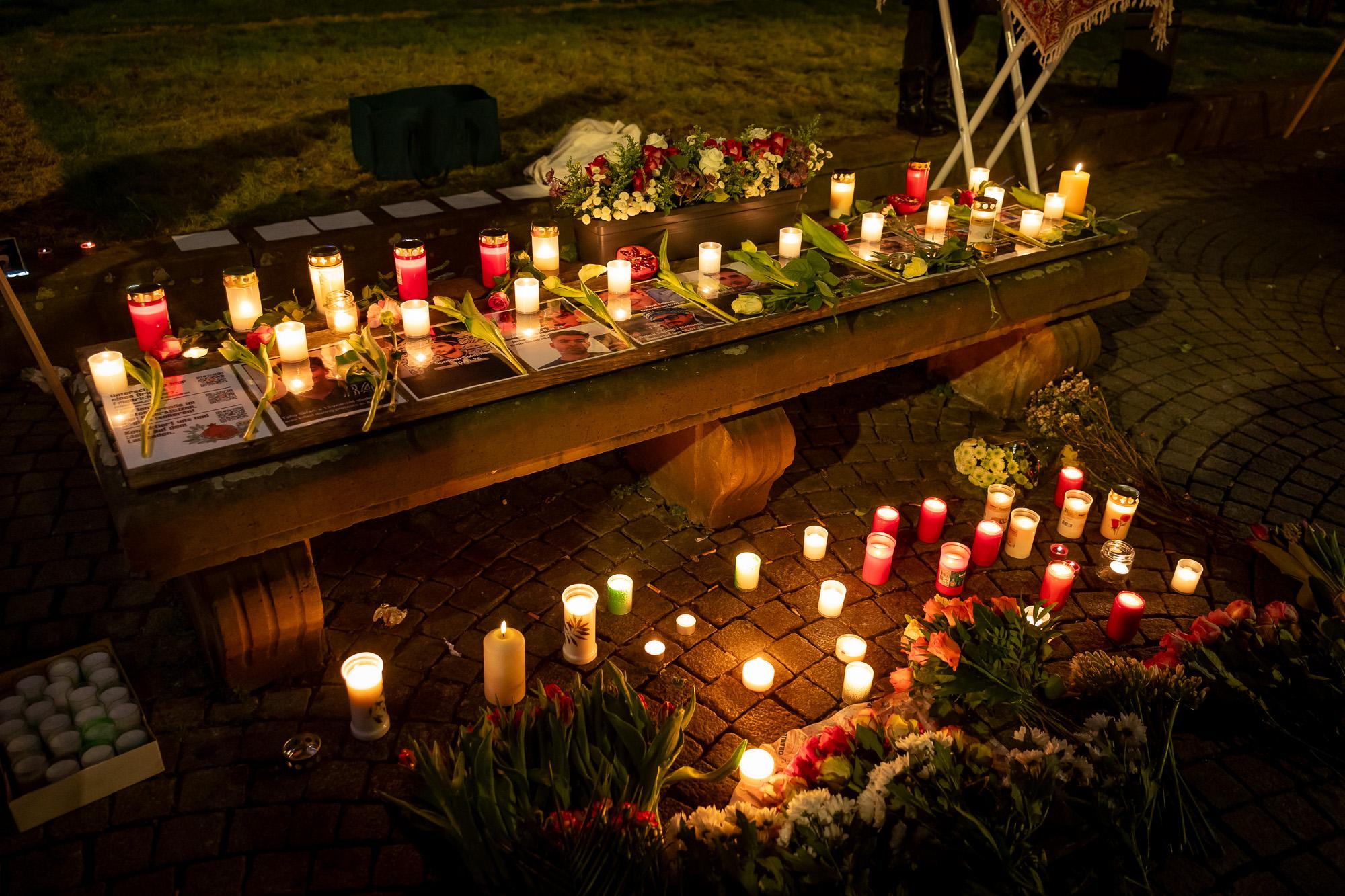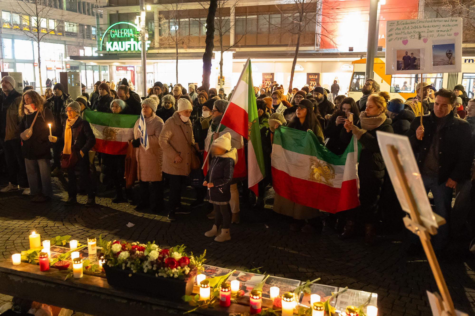 Mannheim, 19. Januar 2026. Zahlreiche Kerzen sorgen am Abend auf dem Paradeplatz für eine ruhige, besinnliche Stimmung, dazwischen Blumen und Fotos von Menschen, die in den vergangenen Wochen bei den Protesten im Iran ums Leben kamen. Die Kundgebung der Initiative „Frauen Leben Freiheit Rhein-Neckar“ ist keine laute Kampfansage an das islamistische Regime in Teheran, vielmehr ein Ort der gemeinsamen Trauer für die hier lebenden Exil-Iraner*innen und ihre Freund*innen.