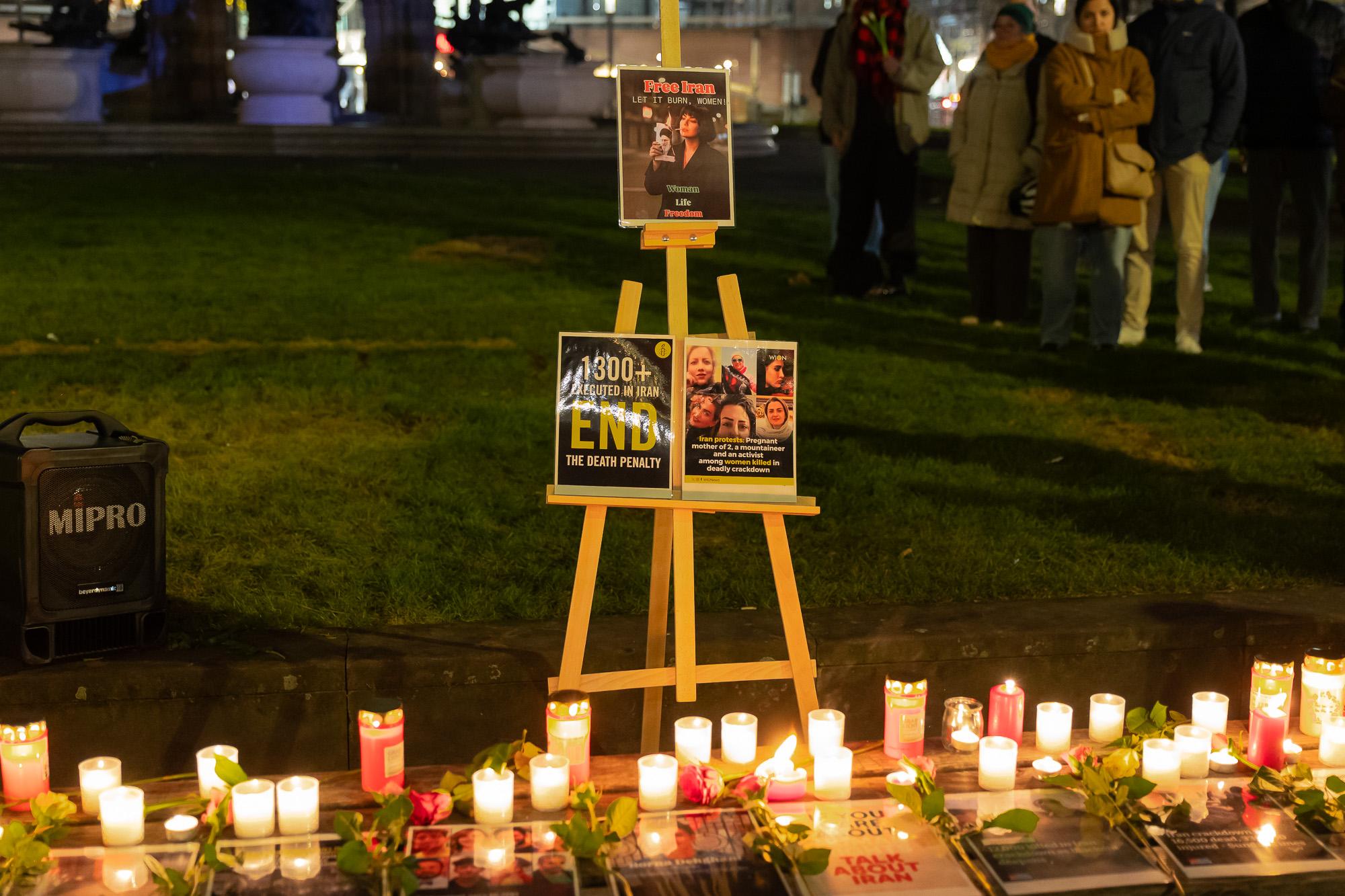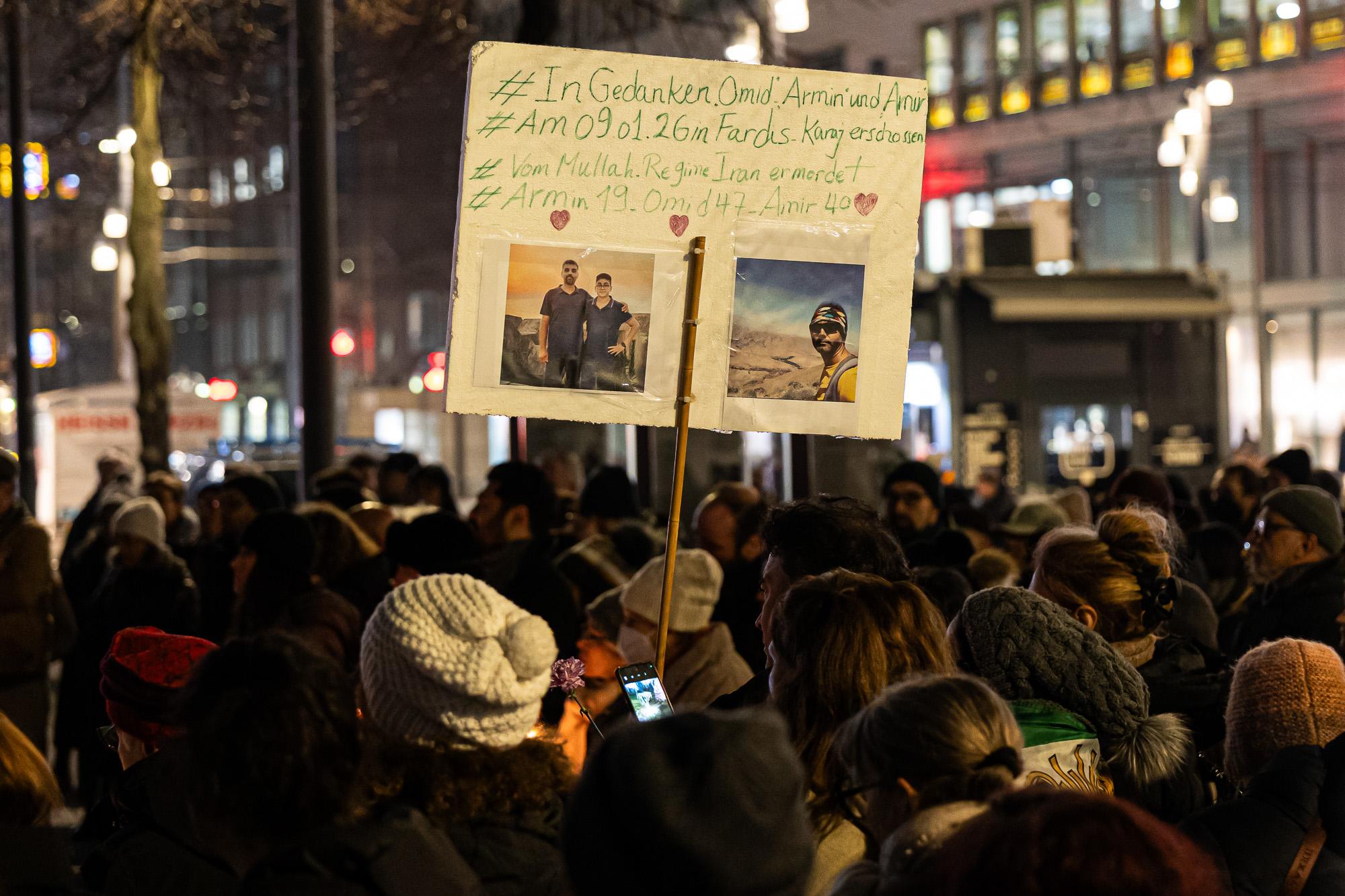 Mehrere Rednerinnen am Mikrofon berichten davon, was sie aus dem Land und von ihren Familien gehört haben. Eine Frau aus dem Publikum spricht mich an und bittet mich, ein Schild zu fotografieren. Dort ist zu lesen, dass drei Männer am 9. Januar vom Mullah Regime erschossen wurden: Armin, 19 Jahre alt, Omid, 47 Jahre alt und Amir, 40 Jahre alt. Der Frau laufen Tränen über die Wangen. Sie berichtet, dass sie in Heidelberg lebt. Von ihrer im Iran lebenden Schwester habe sie die Nachricht über den Tod der drei Familienmitglieder erhalten.