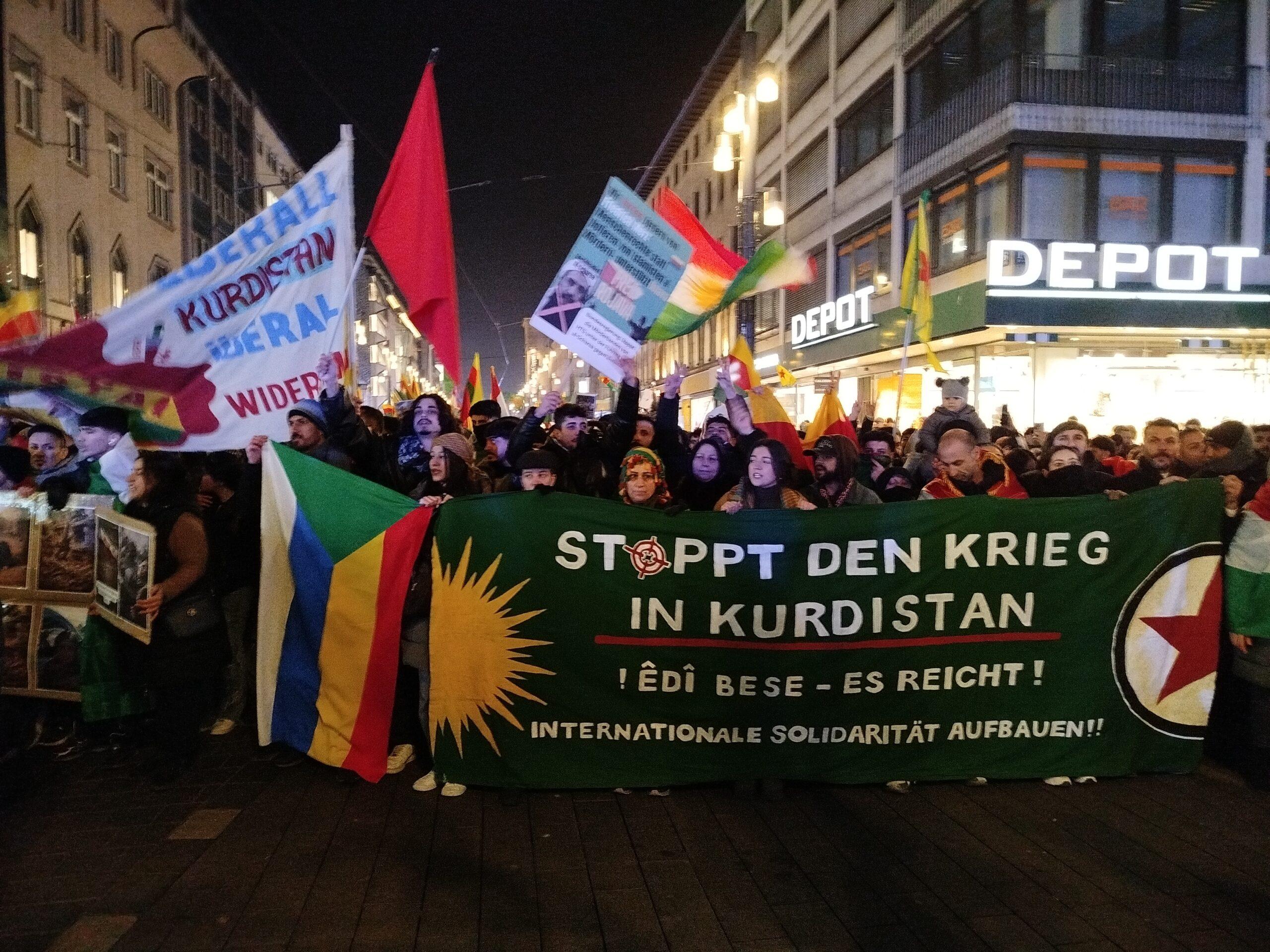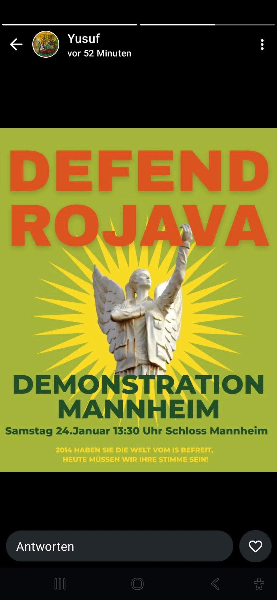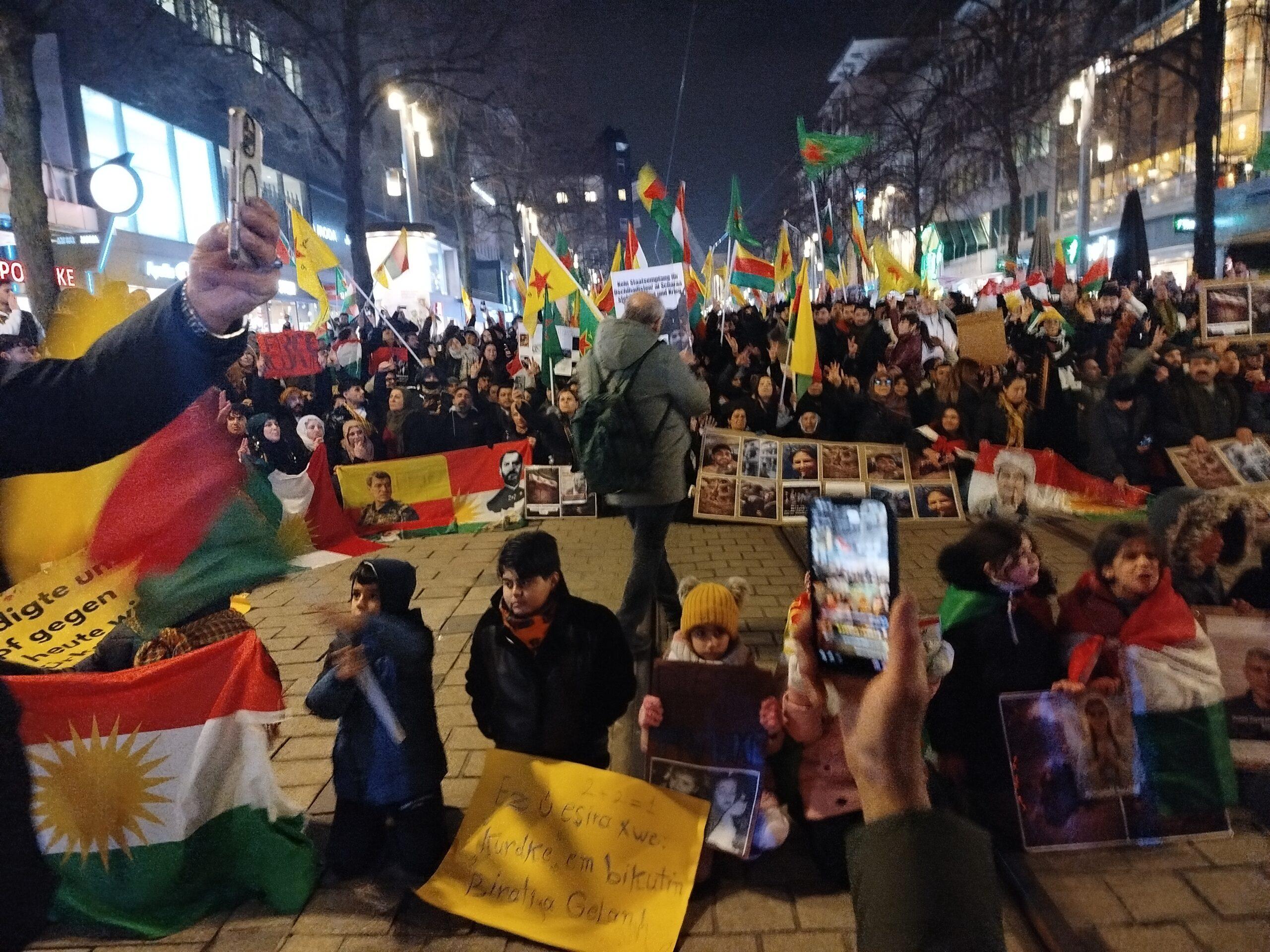 In Mannheim fand am 20. Januar sehr kurzfristig eine Demonstration von geschätzt 4.000 Menschen statt. Die Polizeiangaben von 1.500 Teilnehmern scheint weit untertrieben zu sein. Die Demonstration führte vom Paradeplatz durch die Planken zum Plankenkopf gegenüber des Wasserturms. Die Veranstalter sind aus dem Umfeld des Mesopotamischen Kulturzentrum Mannheim. Offensichtlich wurde durch Mund-zu-Mund Propaganda und Social Media ein großer Kreis der kurdischen Community in der Region erreicht. Obwohl die Stimmung sehr erregt war, konnten die Veranstalter einen friedlichen und störungsfreien Ablauf gewährleisten. Als am Ende der Veranstaltung von