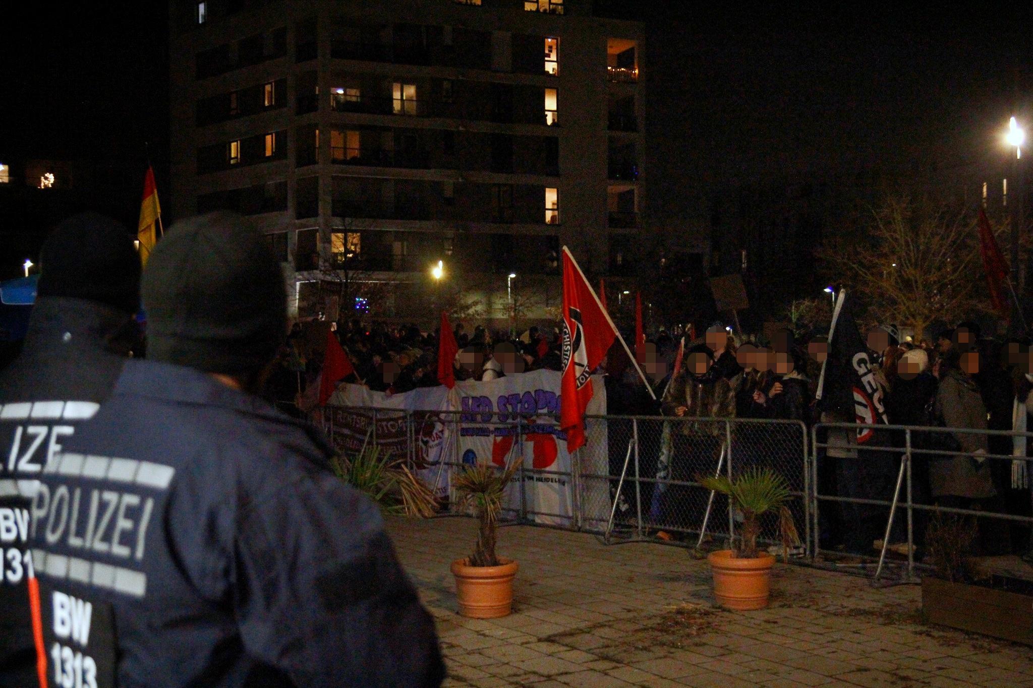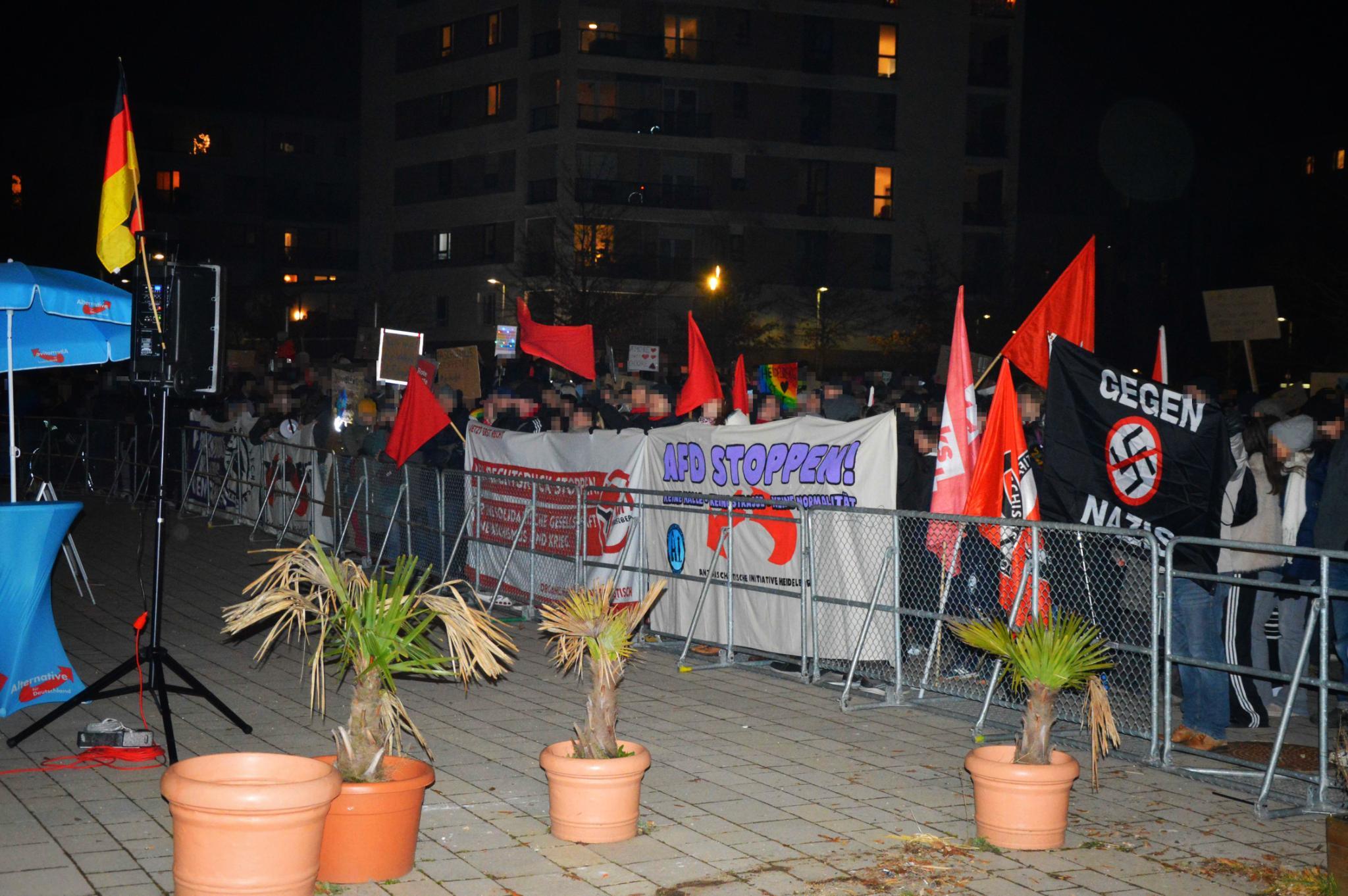 Schon früh entwickelte sich am Rand dieser Kundgebung der Hauptprotest, bei dem zeitweise rund 1.500 Menschen mit Transparenten, Fahnen, Schildern und lautstarken Parolen der AfD unmissverständlich zu erkennen gaben, dass in Heidelberg kein Platz für rechte Hetze ist. Der ursprünglich angedachte Einlass zur Veranstaltung wurde dadurch schnell blockiert, sodass die AfD-Anhänger*innen nach Nebeneingängen suchen mussten. Die Besucher*innen der AfD-Veranstaltung mussten über die gesamte Dauer antifaschistische Parolen und ein Pfeifkonzert über sich ergehen lassen.