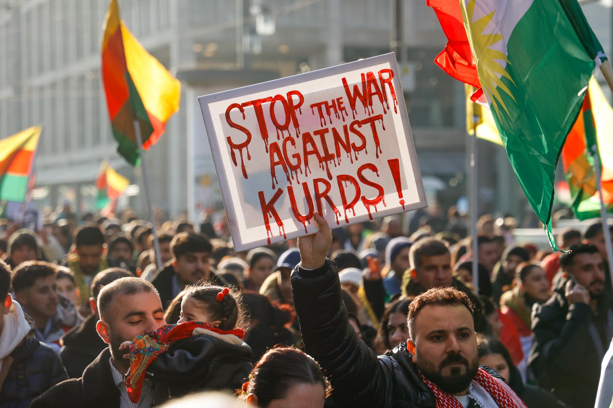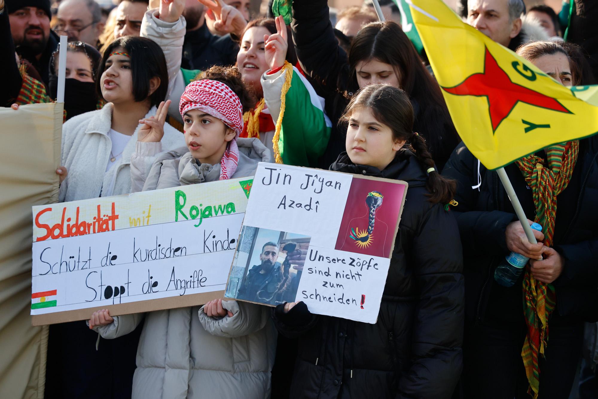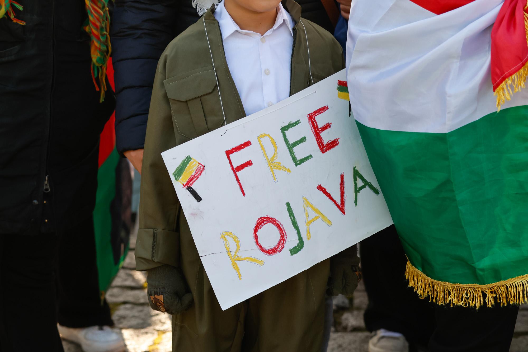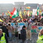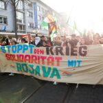 Die türkische Regierung unterstützt die Angriffe auf Rojava, da sie mit dem demokratischen Projekt ein Erstarken des kurdischen Selbstbewusstseins befürchtet, dass sich auf die gesamte Region ausdehnen könnte. In der Türkei gibt es seit Jahrzehnten Konflikte mit der kurdischen Bevölkerung. Die türkische Regierung sieht in den politischen und militärischen Strukturen der Region Rojava eine Ableger der in der Türkei verbotenen PKK. Mit Drohnen, Luftschlägen und Waffen für islamistische Milizen unterstütze die Türkei die Angriffe auf Rojava, so die Kritik der Demonstrant*innen.