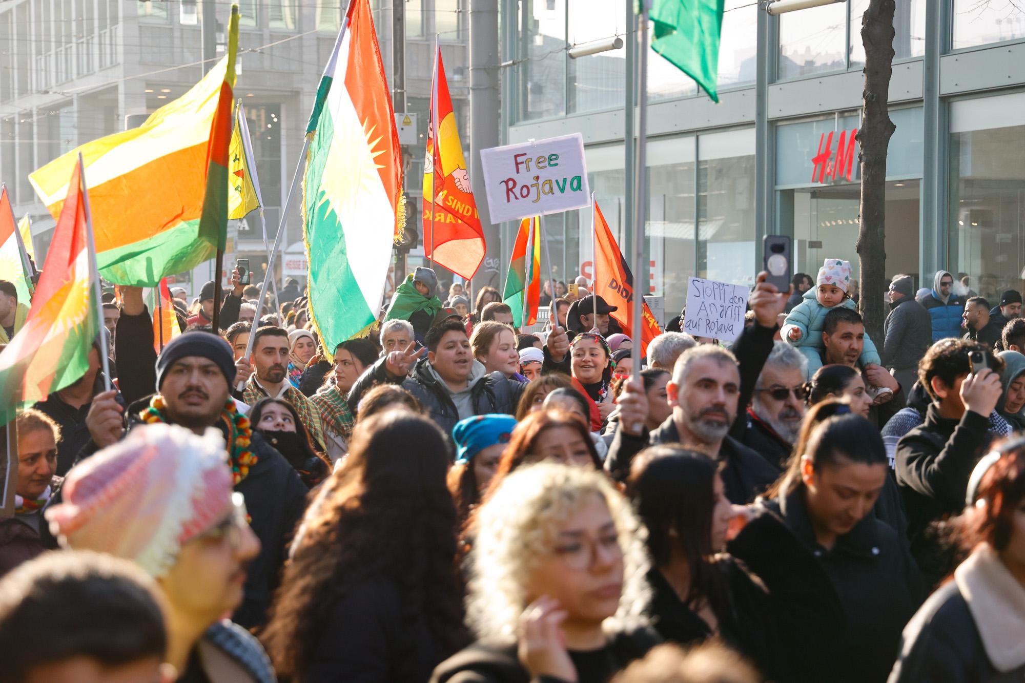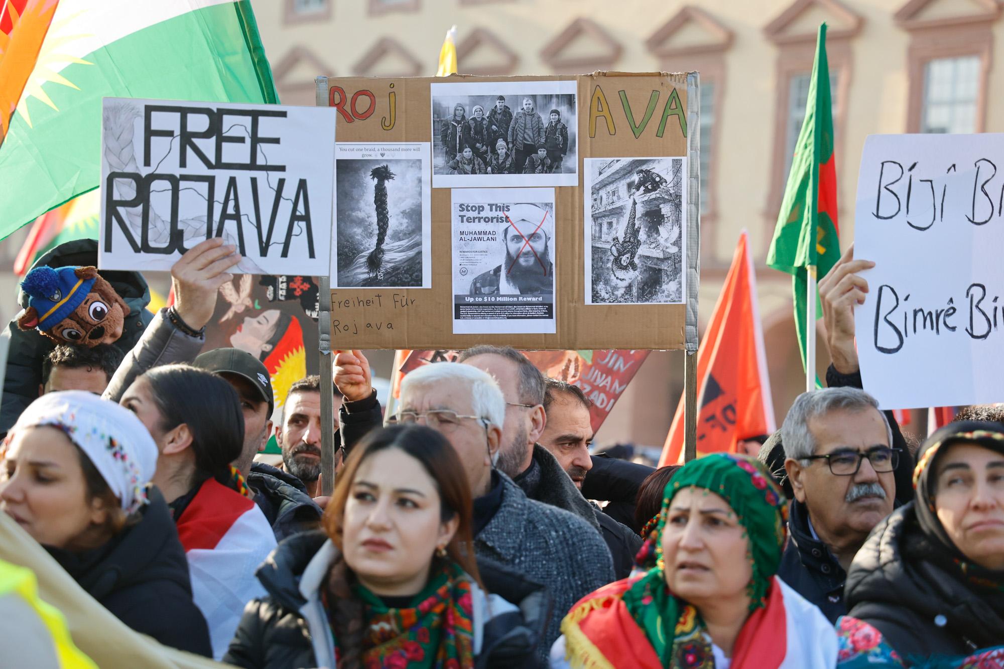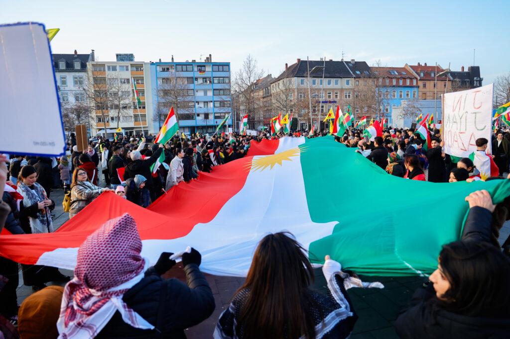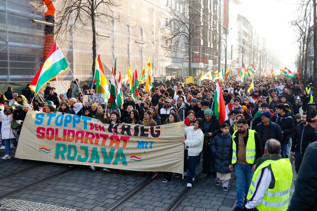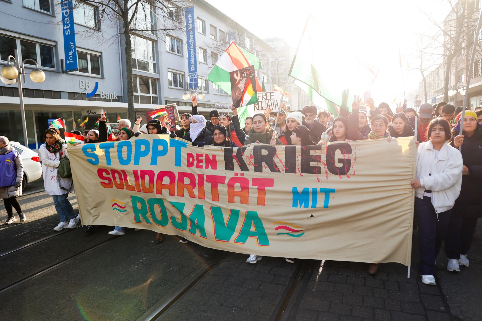 In Mannheim sind am Samstag tausende Kurdinnen und Kurden aus der ganzen Region in Solidarität mit der selbstverwalteten Region Rojava auf die Straße gegangen. Die demokratische und autonom verwaltete Region Rojava liegt in Nordostsyrien und wird aktuell von der staatlichen syrischen Armee angegriffen. Der Region soll die Autonomie aberkannt werden. Der islamistische Interimspräsident Ahmed al-Scharaa, auch genannt Al Dscholani, will die Region in seinen Staat eingliedern. Dabei wird er von islamistischen Milizen und der türkischen Regierung unterstützt.