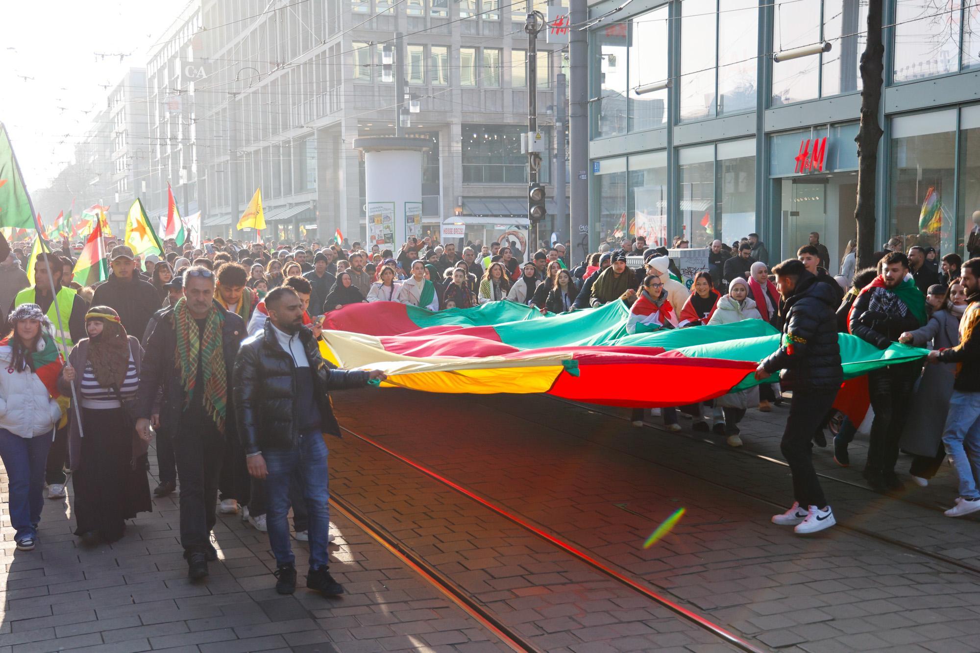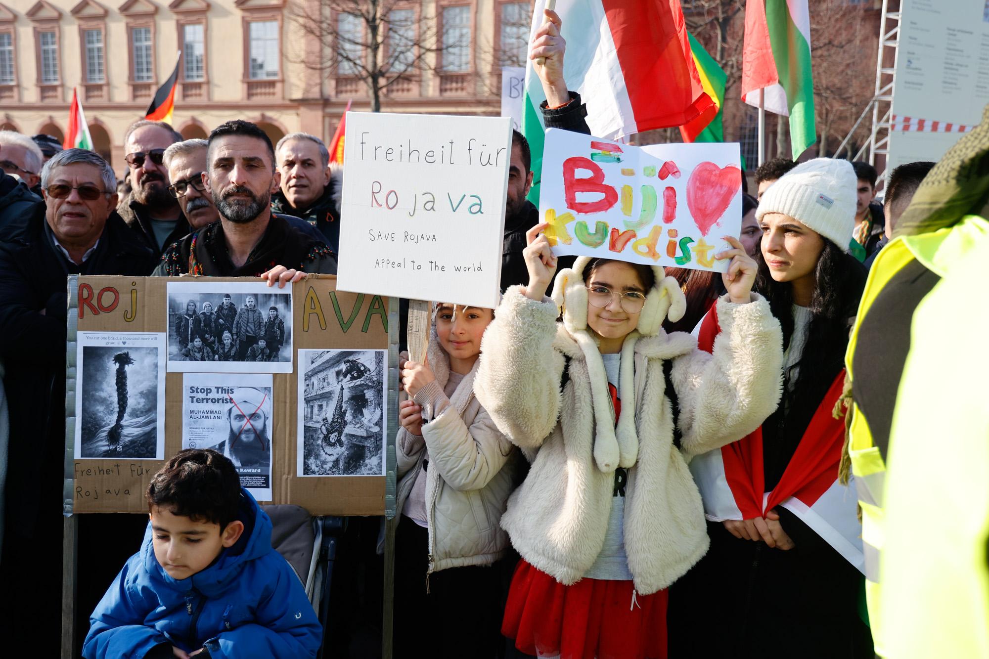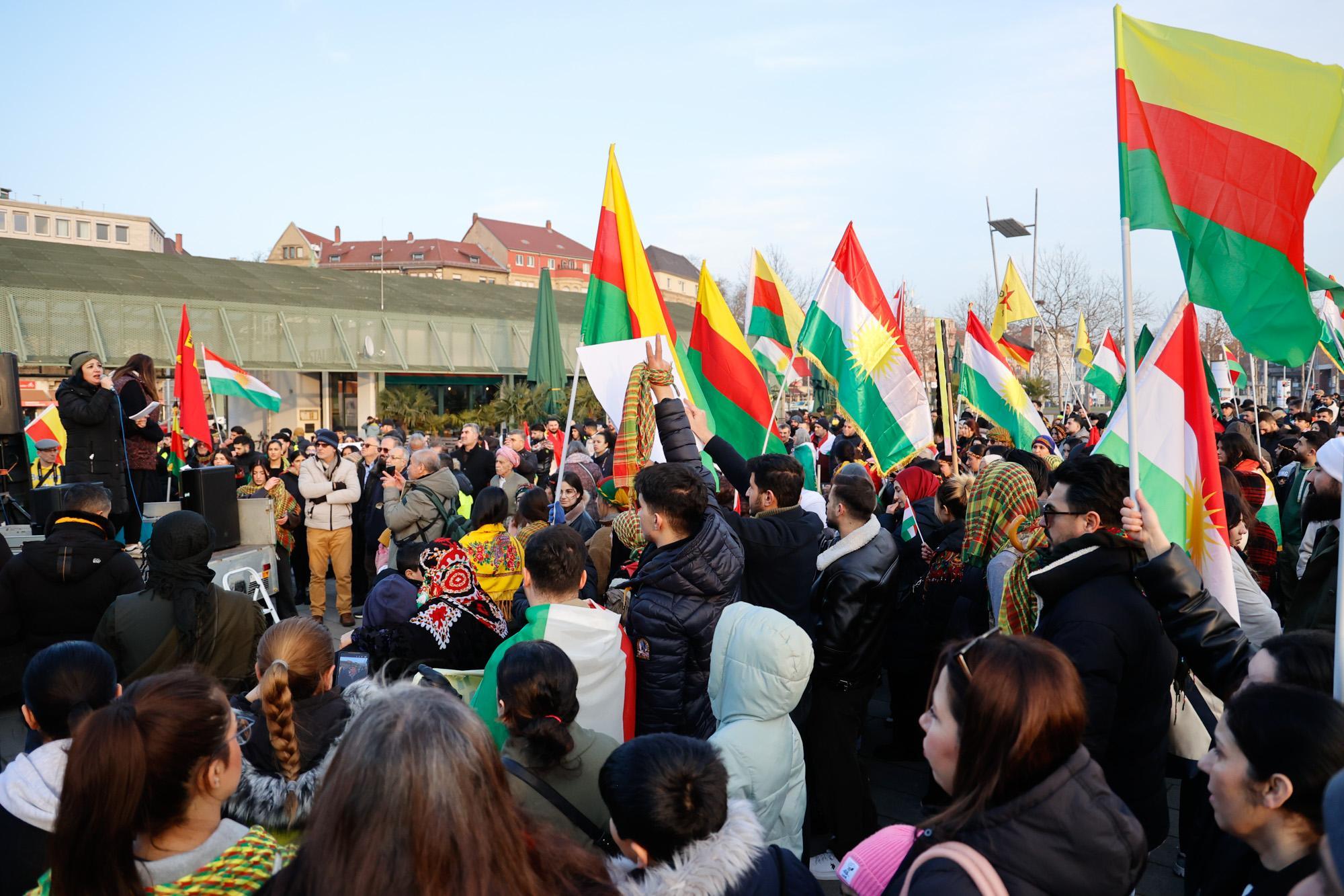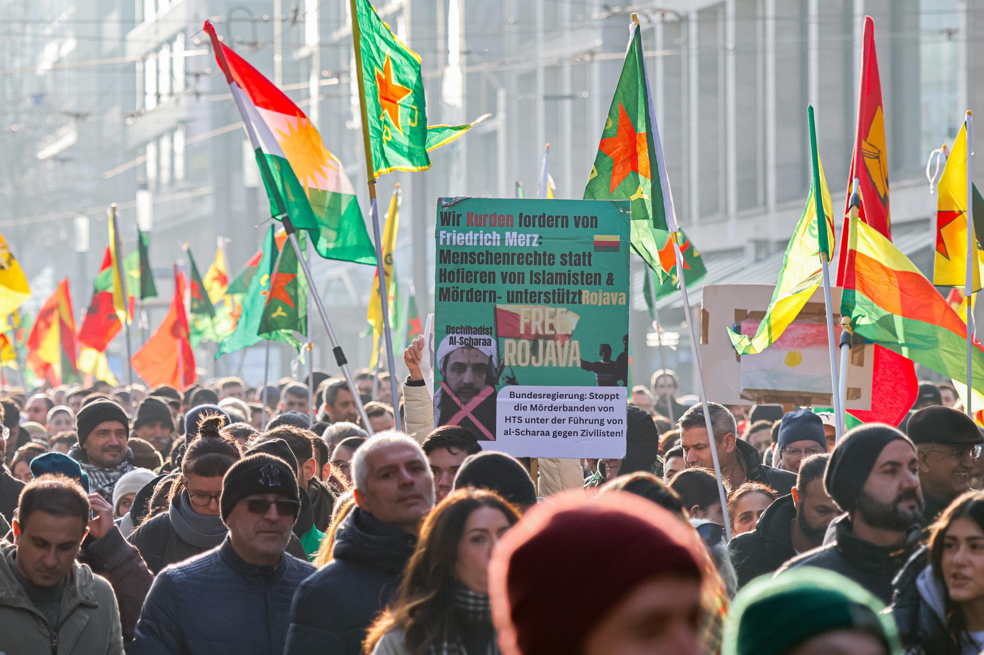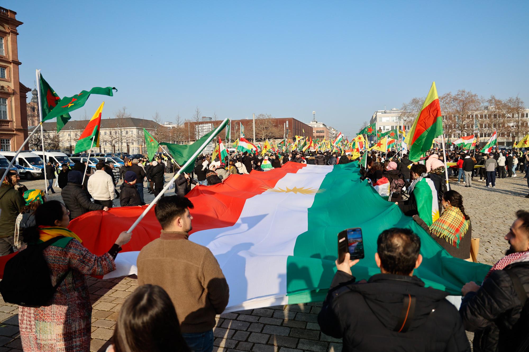 In Mannheim sind am Samstag tausende Kurdinnen und Kurden aus der ganzen Region in Solidarität mit der selbstverwalteten Region Rojava auf die Straße gegangen. Die demokratische und autonom verwaltete Region Rojava liegt in Nordostsyrien und wird aktuell von der staatlichen syrischen Armee angegriffen. Der Region soll die Autonomie aberkannt werden. Der islamistische Interimspräsident Ahmed al-Scharaa, auch genannt Al Dscholani, will die Region in seinen Staat eingliedern. Dabei wird er von islamistischen Milizen und der türkischen Regierung unterstützt.