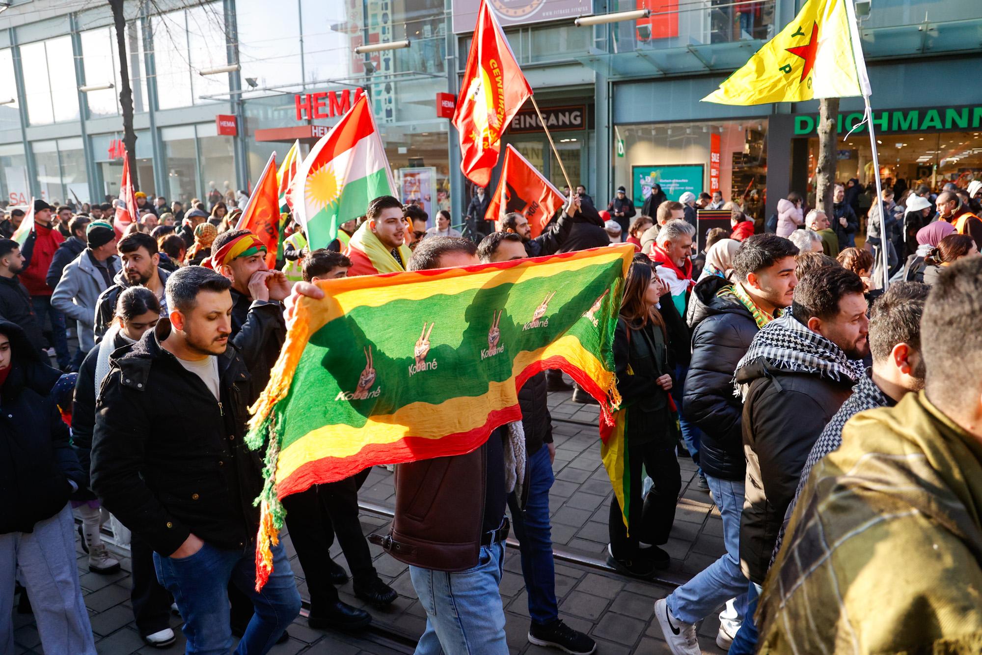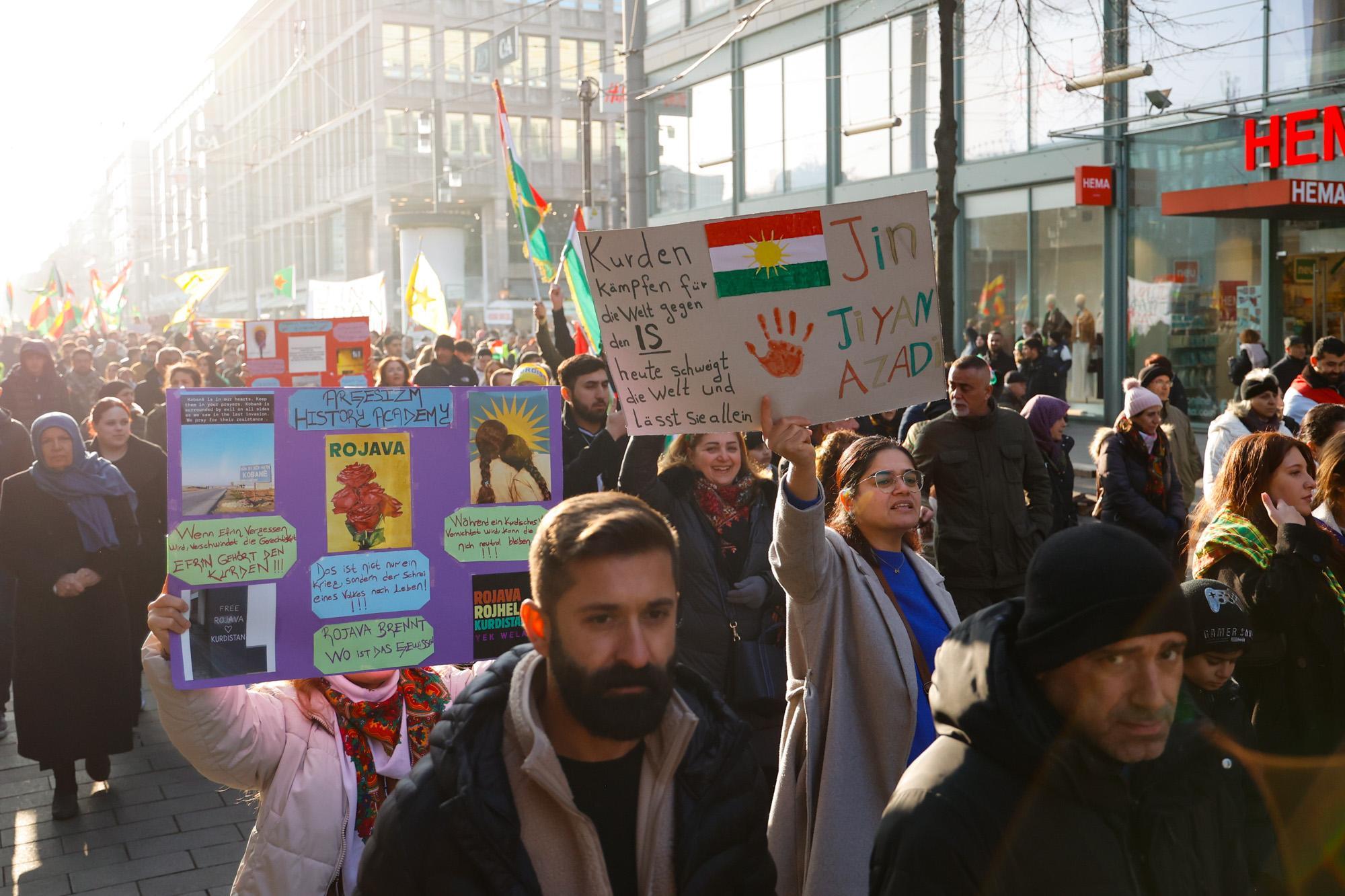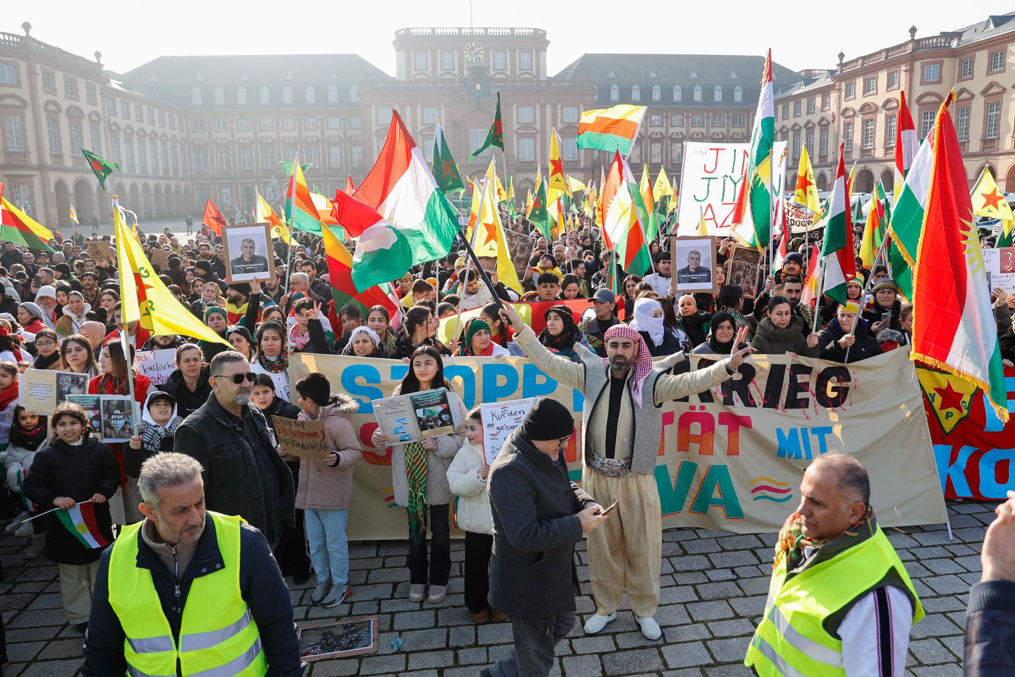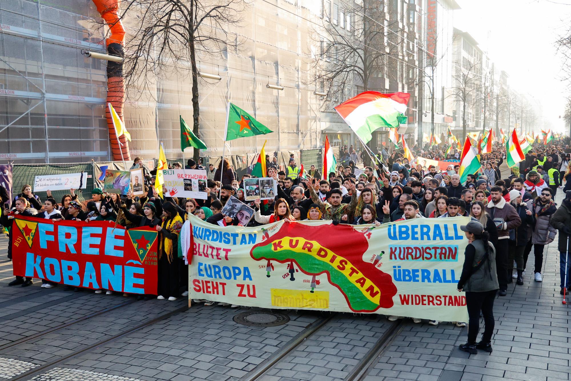 In Mannheim sind am Samstag tausende Kurdinnen und Kurden aus der ganzen Region in Solidarität mit der selbstverwalteten Region Rojava auf die Straße gegangen. Die demokratische und autonom verwaltete Region Rojava liegt in Nordostsyrien und wird aktuell von der staatlichen syrischen Armee angegriffen. Der Region soll die Autonomie aberkannt werden. Der islamistische Interimspräsident Ahmed al-Scharaa, auch genannt Al Dscholani, will die Region in seinen Staat eingliedern. Dabei wird er von islamistischen Milizen und der türkischen Regierung unterstützt.