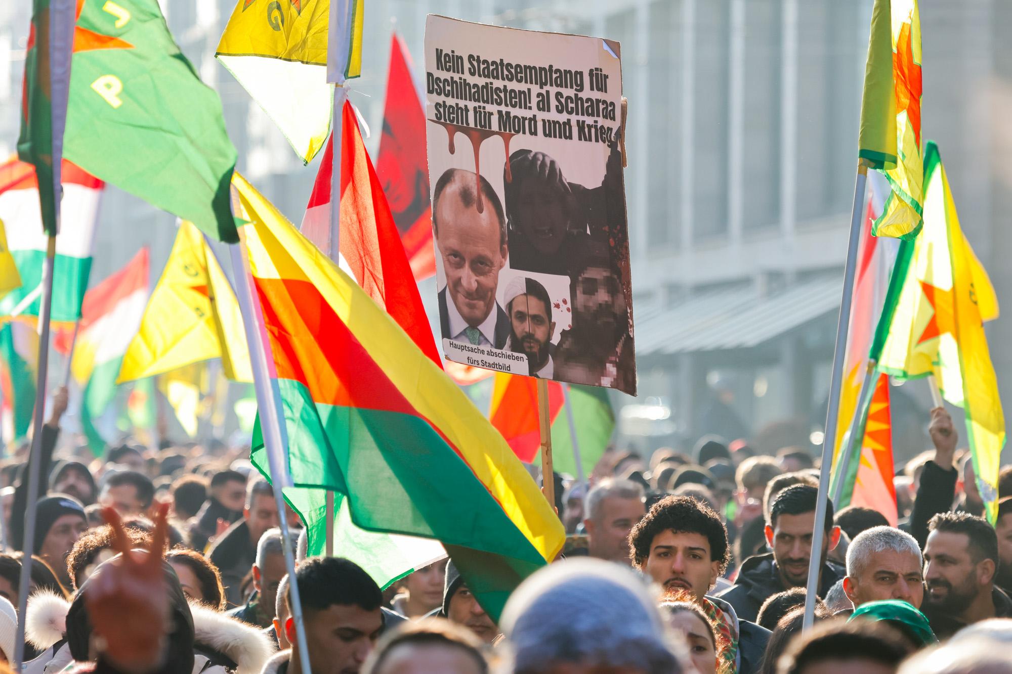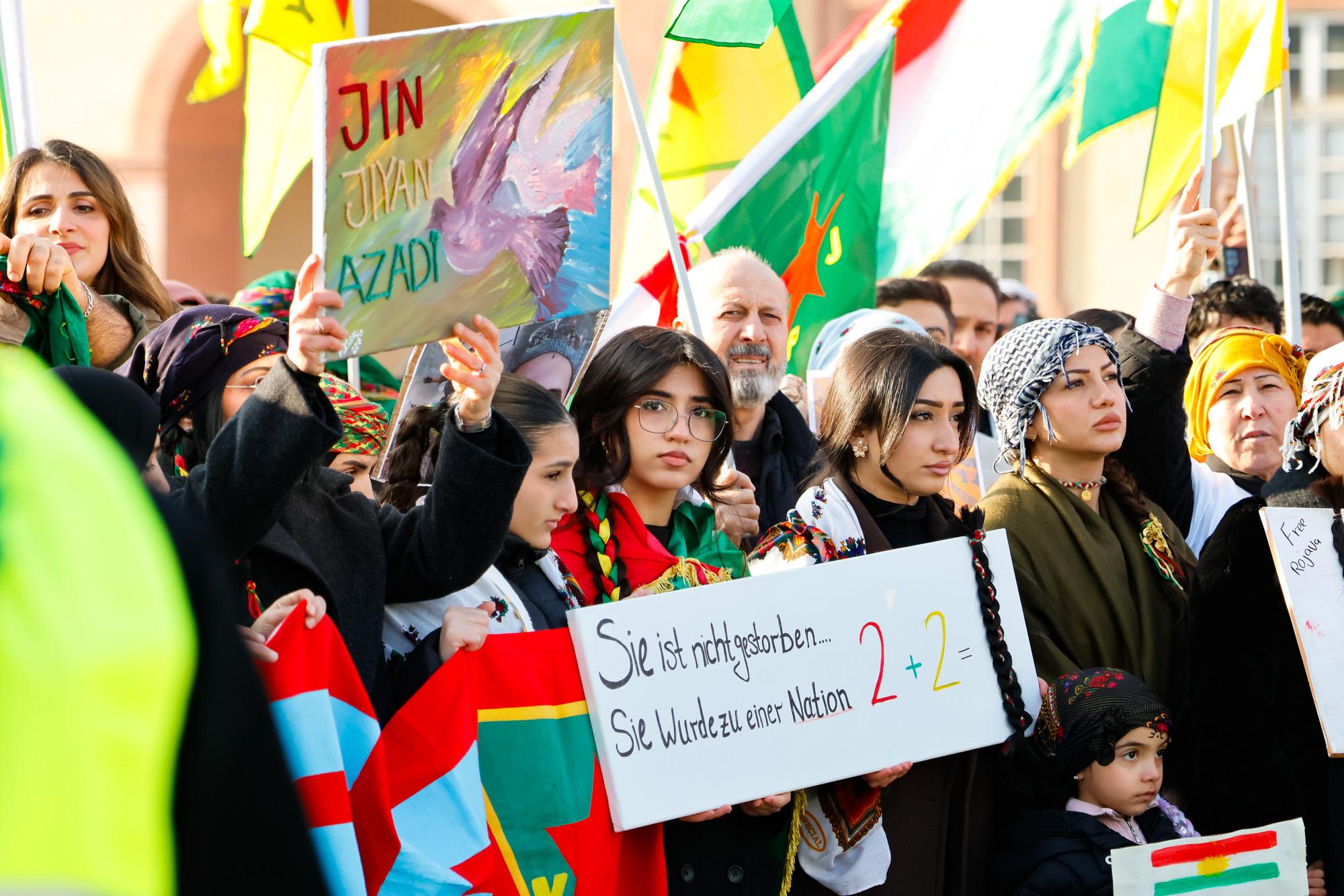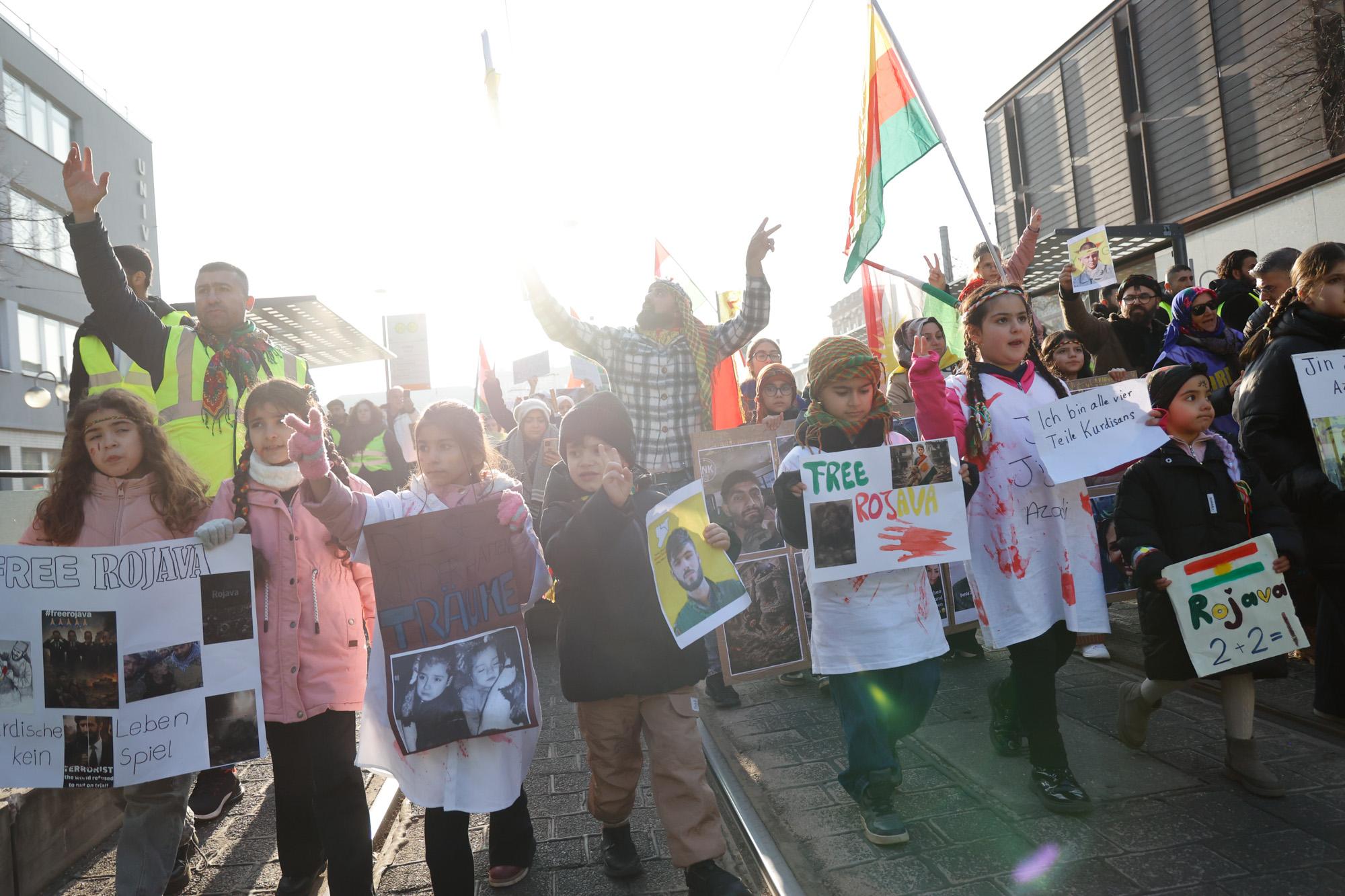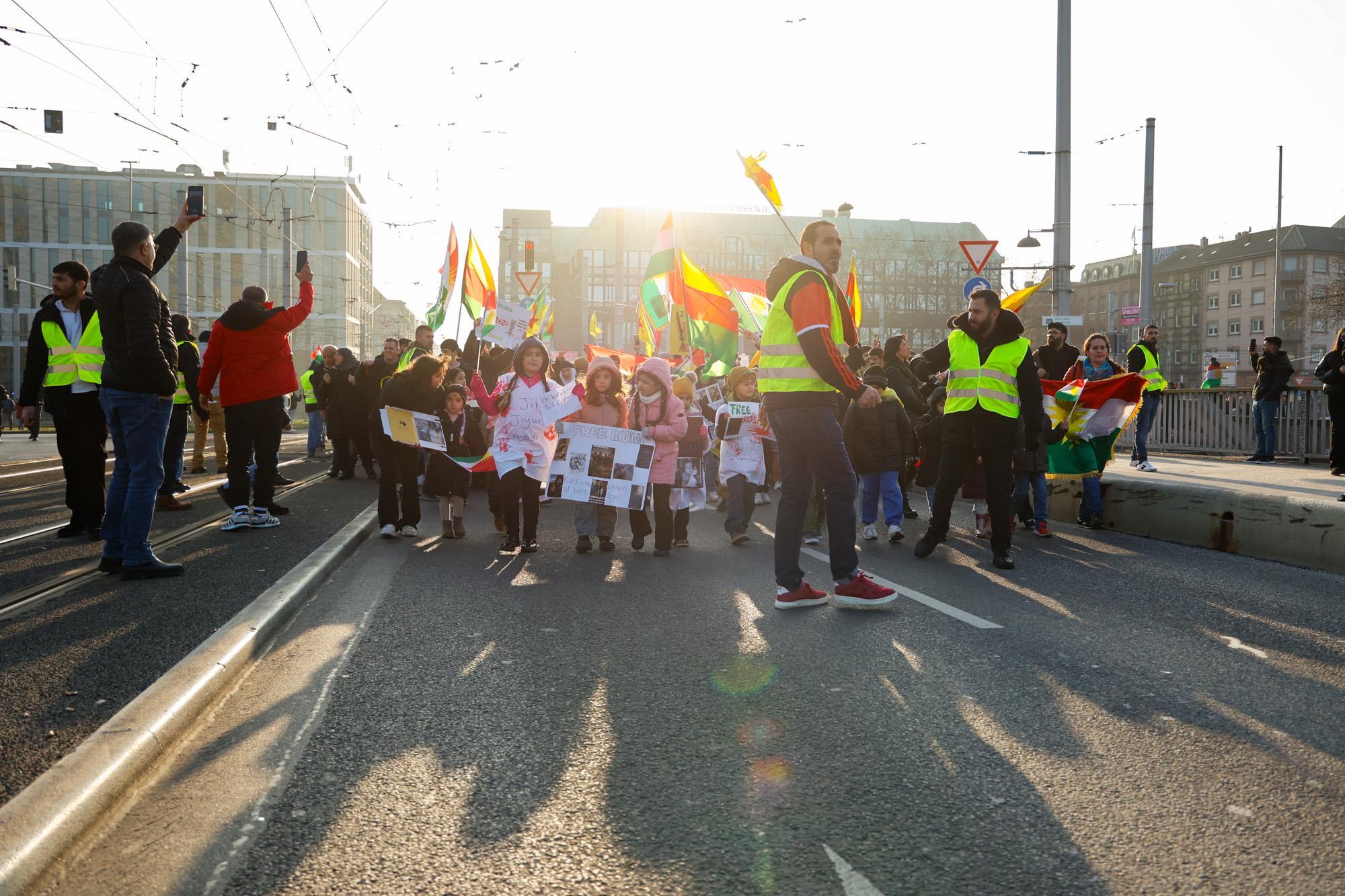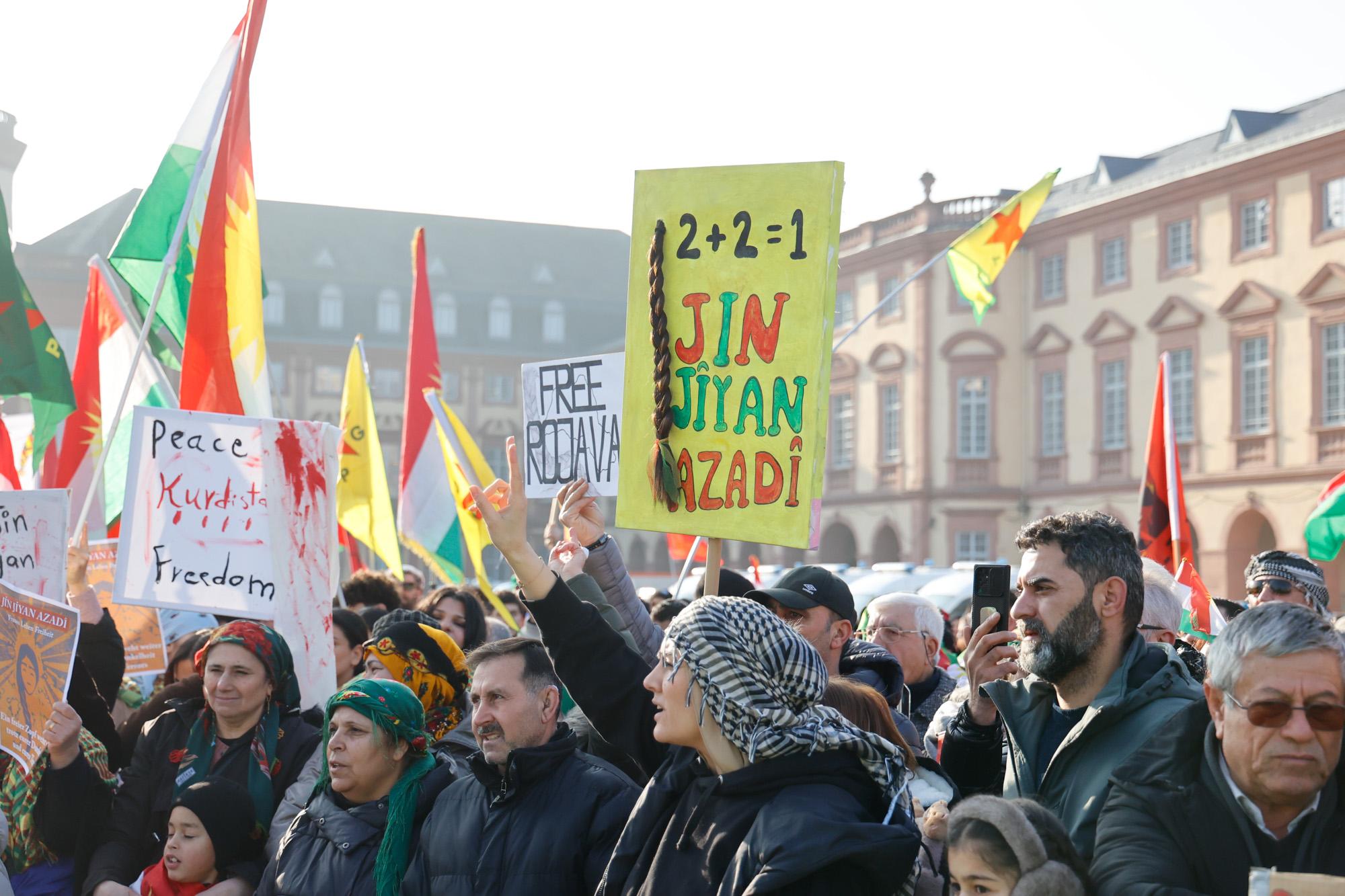 In Mannheim sind am Samstag tausende Kurdinnen und Kurden aus der ganzen Region in Solidarität mit der selbstverwalteten Region Rojava auf die Straße gegangen. Die demokratische und autonom verwaltete Region Rojava liegt in Nordostsyrien und wird aktuell von der staatlichen syrischen Armee angegriffen. Der Region soll die Autonomie aberkannt werden. Der islamistische Interimspräsident Ahmed al-Scharaa, auch genannt Al Dscholani, will die Region in seinen Staat eingliedern. Dabei wird er von islamistischen Milizen und der türkischen Regierung unterstützt.