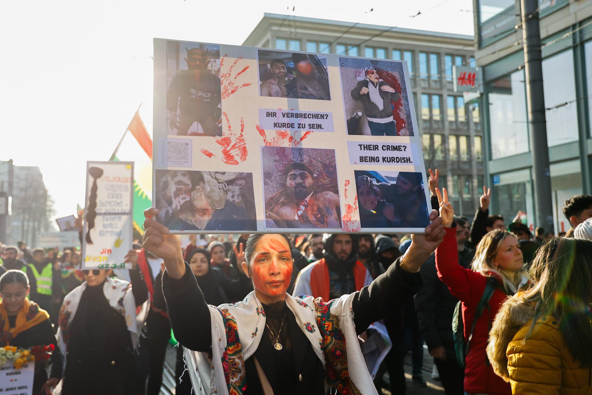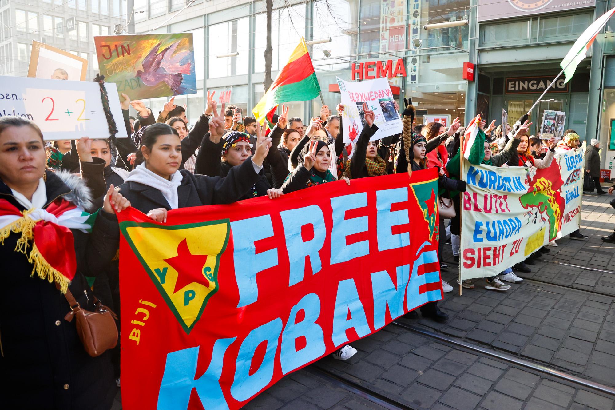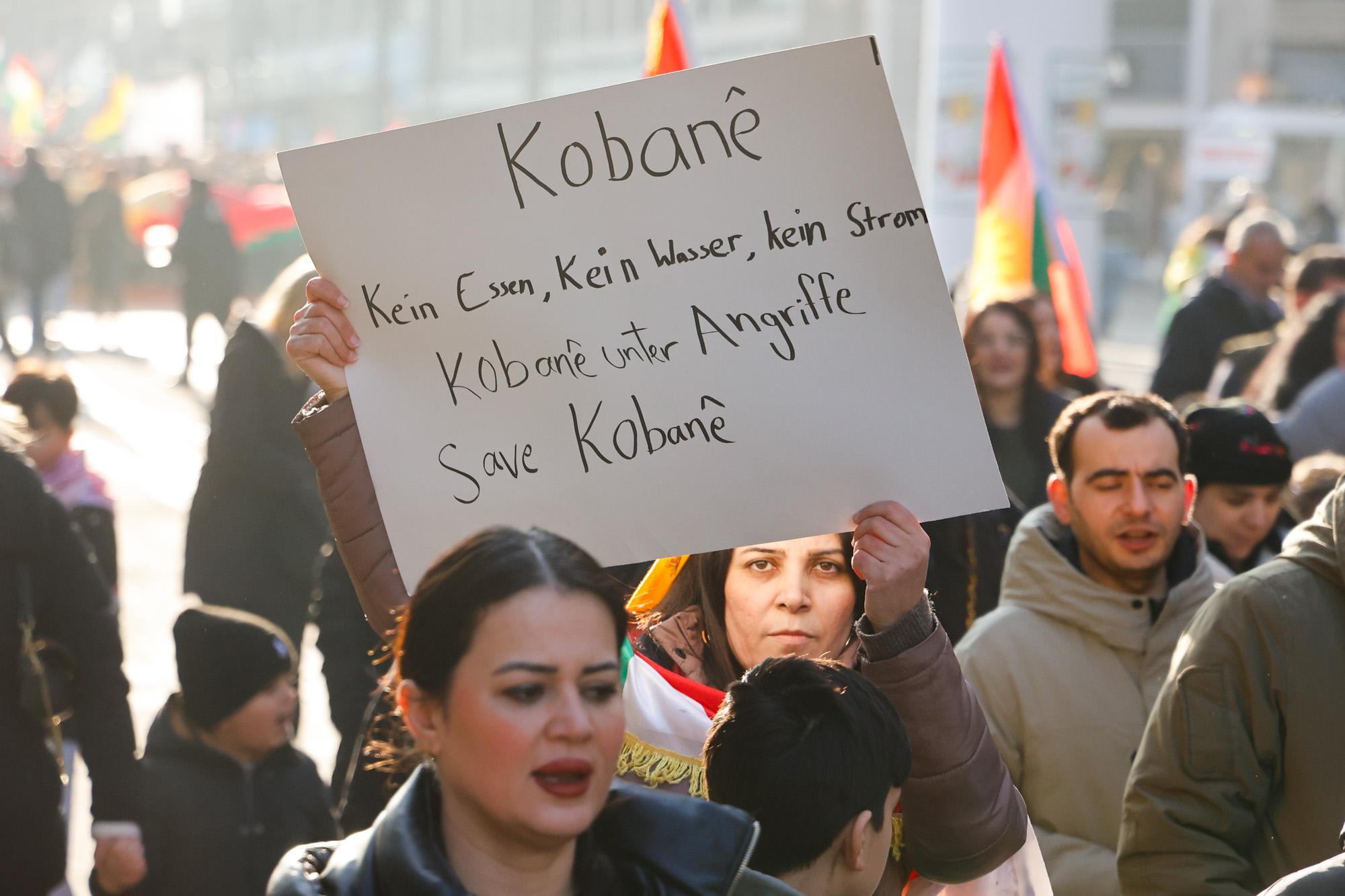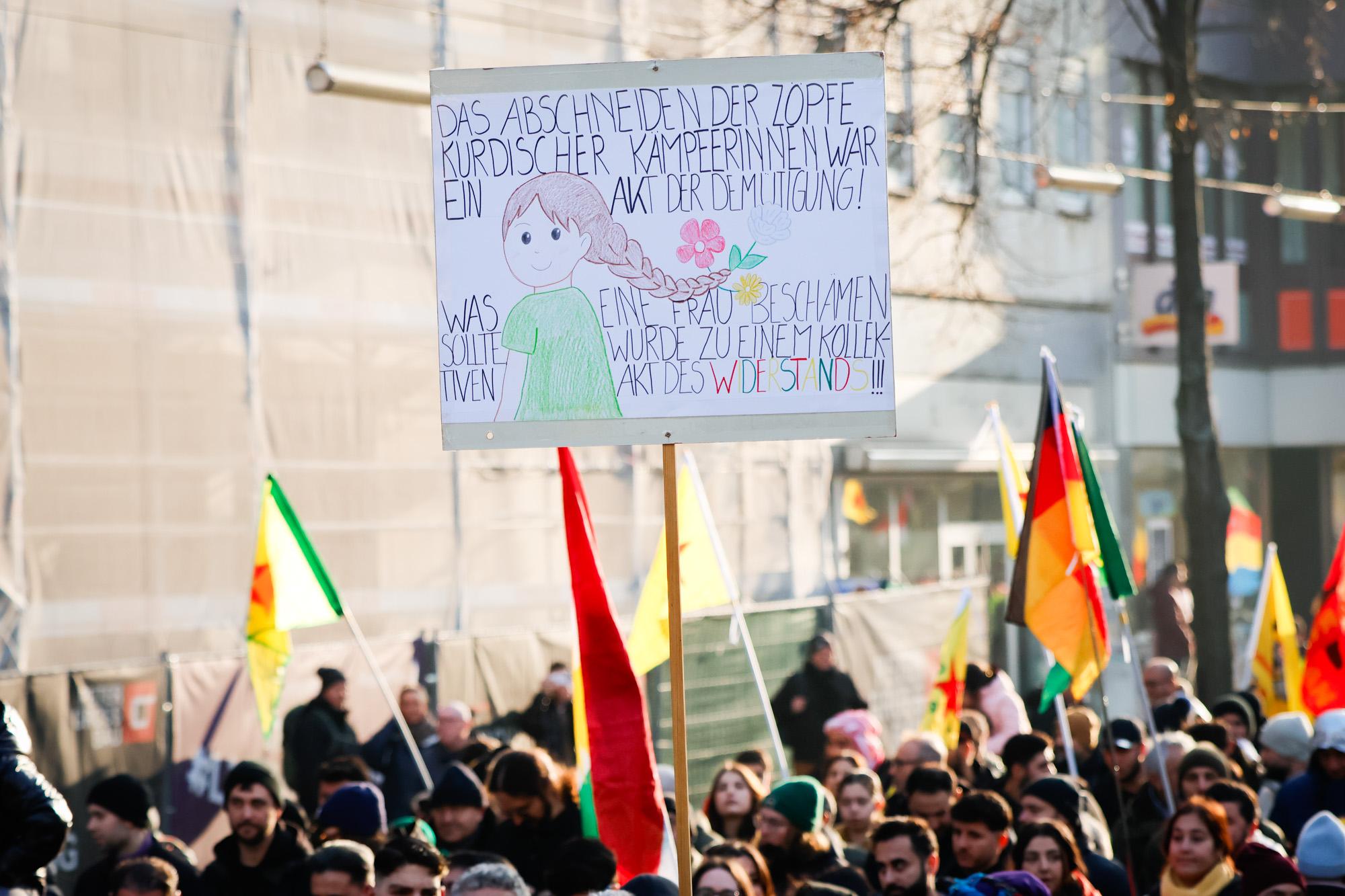 Die Demonstration am Samstagnachmittag wurde vom Kurdischen Verein organisiert und mobilisierte tausende Kurd*innen aus der ganzen Region. Es ging vom Schloss durch die Breite Straße bis zum Alten Messplatz. Die emotionale Betroffenheit war groß, entsprechend viele Menschen hatte das Bedürfnis, ihre Wut und Verzweiflung nicht alleine zu Hause erleben zu müssen. Zahlungen und Schätzungen der Veranstalter*innen gingen von 6.000 bis 10.000 Teilnehmer*innen aus. Die Polizei sprach von 6.000 Personen und einer „weitesgehend störungsfreien“ Versammlung.