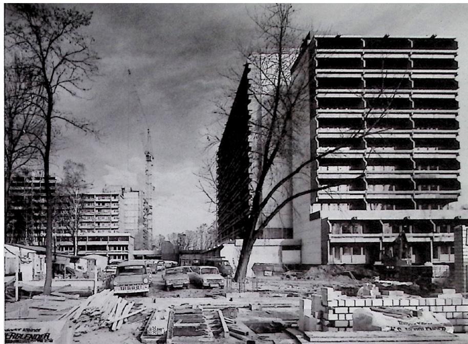 Baustelle Wohnbebauung Herzogenried, im Vordergrund Block B (Am Brunngarten) | Quelle: siehe [3], S. 202. Serielle Bauweise, auch in der Durlacher Straße in Rheinau vertreten.