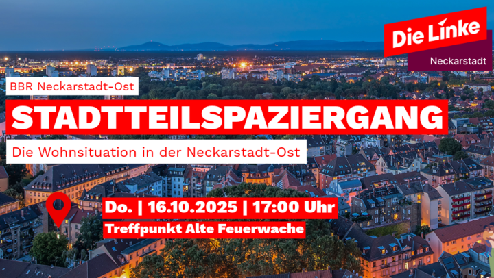 Die Linke Kreisverband Mannheim lädt zum Stadtteilspaziergang „Die Wohnsituation in der Neckarstadt-Ost“ ein. Wann: Donnerstag, 16.10.2025, 17 Uhr. Wo: Alte Feuerwache. Dauer: ca. 1,5 Stunden