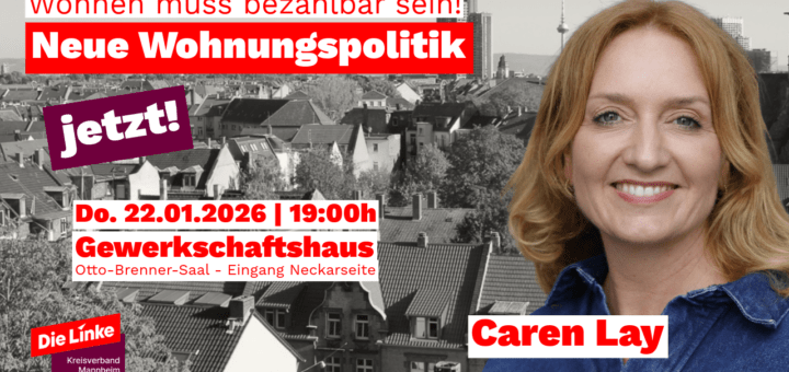 Wohnungspolitische Veranstaltung mit Caren Lay am 22. Januar in Mannheim Am 22. Januar fand eine Veranstaltung der Mannheimer Linken mit Caren Lay im Gewerkschaftshaus statt. Thema: Wohnen muss bezahlbar sein – Für eine andere Wohnungspolitik! Caren Lay ist Bundestagsabgeordnete der Linken und Sprecherin der Fraktion für Mieten-, Bau- und Wohnungspolitik sowie...