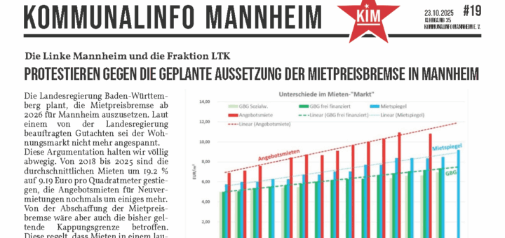 Die Linke Mannheim und die Gemeinderatsfraktion LTK (Die Linke, Tierschutzpartei, Klimaliste) kritisieren den Herausfall Mannheims aus der Mietpreisbremse ab dem 01.01.2026. Voraussetzung für das Inkrafttreten der Mietpreisbremse in einer Stadt ist ein Gutachten des Landes, bei dem vier von fünf Kriterien für einen angespannten Wohnungsmarkt erfüllt sein müssen. In den...