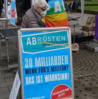 40 Personen in Mannheim fordern öffentlich: Abrüsten statt Aufrüsten! Am 5. Dezember rief die Friedensbewegung in vielen Städten in Deutschland zu dezentralen Aktionen auf. In Mannheim gab es an diesem Tag einen Aktionsstand auf dem Paradeplatz. Auf der Facebook-Seite der Deutschen Friedensgesellschaft/Vereinigte KriegsdienstgegnerInnen (DFG-VK-Gruppe MA-LU) schreibt die Gruppe hierzu: Die...