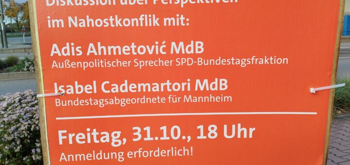 Klares Bekenntnis zum Internationalen Völkerrecht – Nur eine Zwei-Staaten Lösung kann Frieden bringen Verurteilung der in Mannheim geübten Praxis, israel-kritische Veranstaltungen zu verhindern. Die Bundestagsabgeordnete Isabel Cademartori lud für den 31.Oktober ein zur Veranstaltung mit Adis Ahmetović dem unter dem Titel „Wie geht es weiter in Gaza?“ Der 32-Jährige Adis...